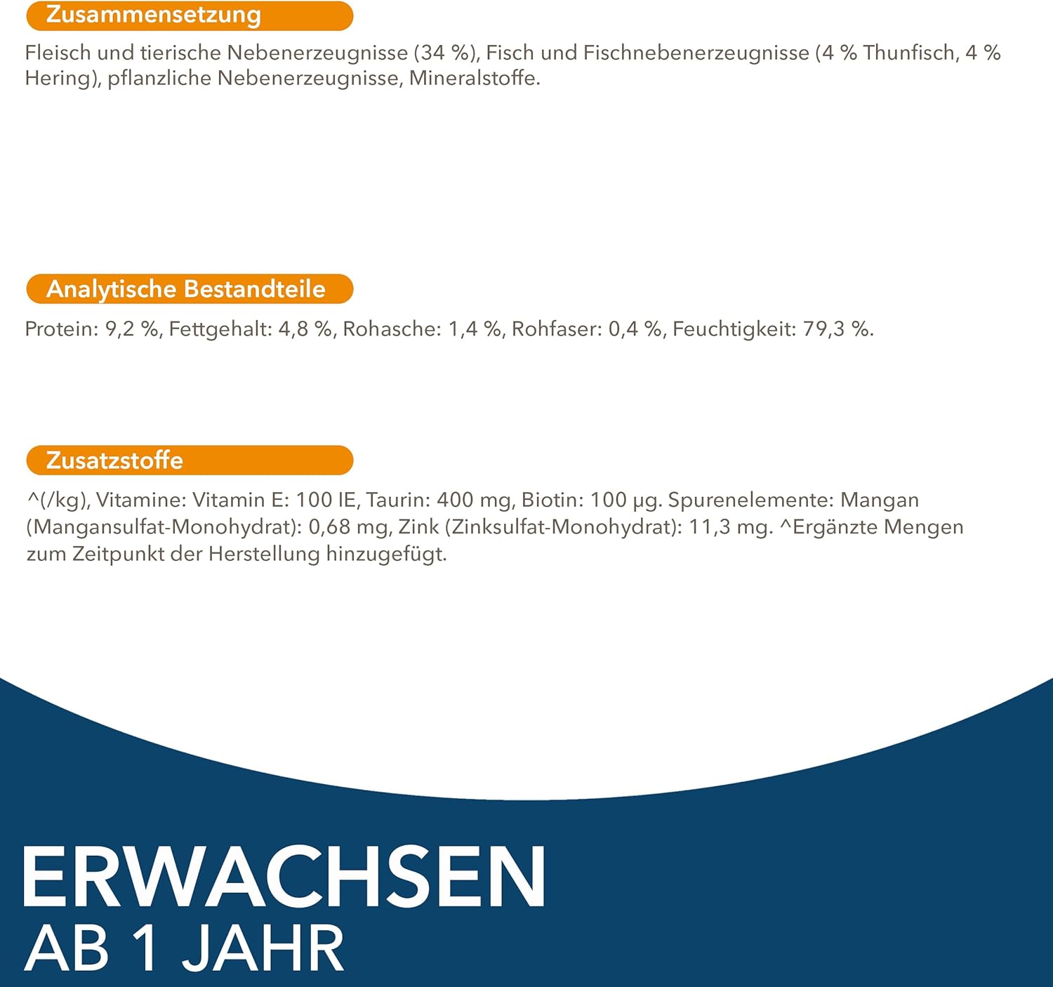Hochwertiges Nassfutter für ausgewachsene Katzen ab 1 Jahr mit Thunfisch und Hering in Gelee – ohne künstliche Farb-, Aroma- und Füllstoffe sowie GVO