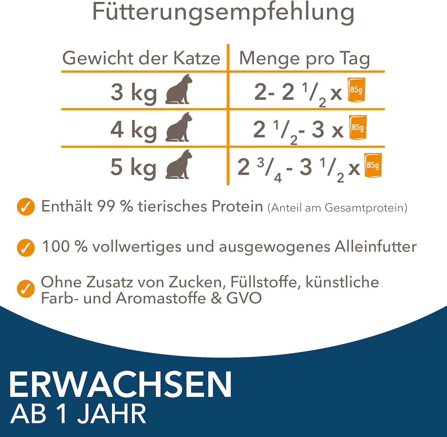 Das Nassfutter für ausgewachsene Katzen in Gelee enthält alle Nährstoffe für eine gesunde, artgerechte Ernährung und enthält 99 Prozent tierische Proteine aus Fleisch und Fisch (Anteil am Gesamtproteingehalt)