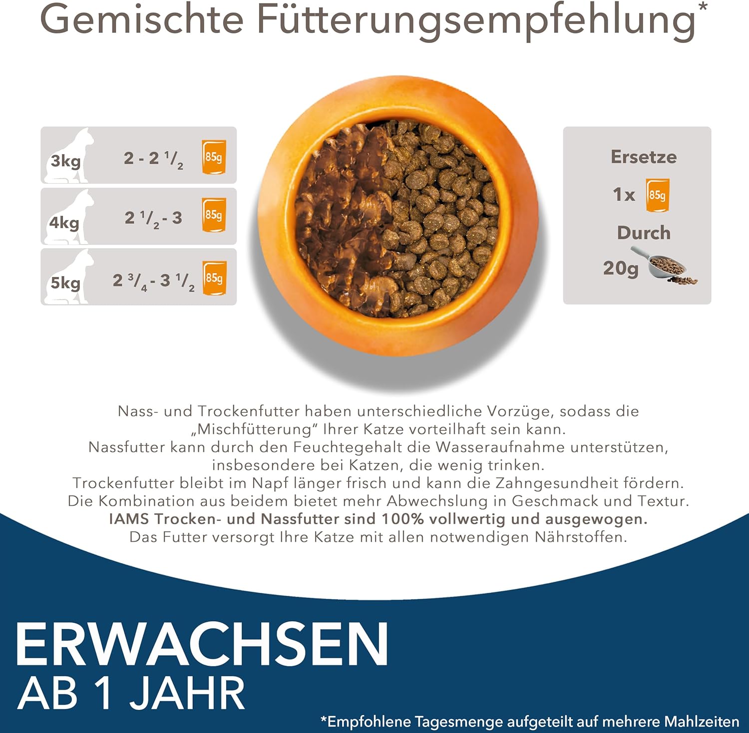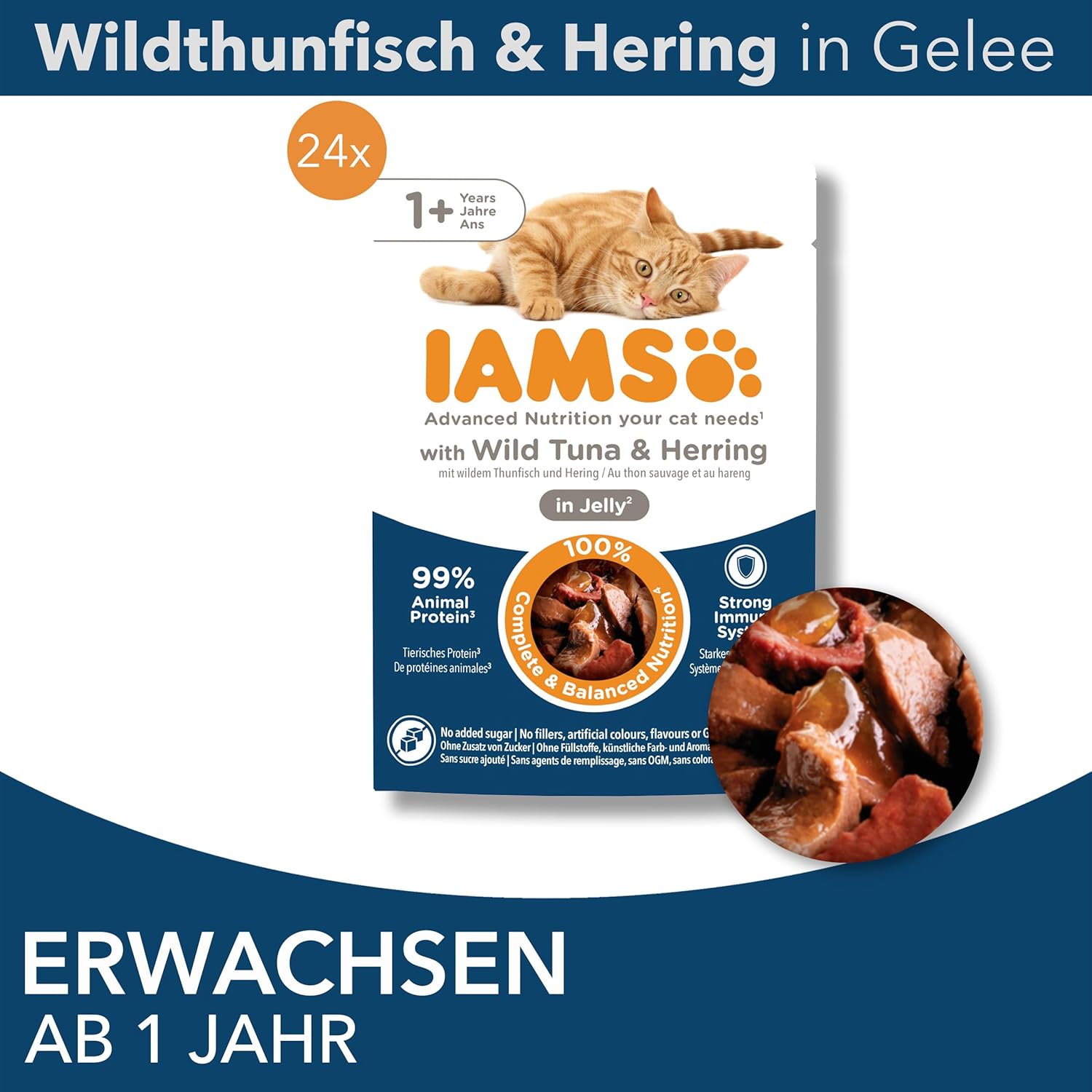 Lieferumfang: IAMS Katzenfutter für ausgewachsene Katzen mit 24 x 85 g Nassfutter in Gelee in der Geschmacksrichtung Thunfisch und Hering