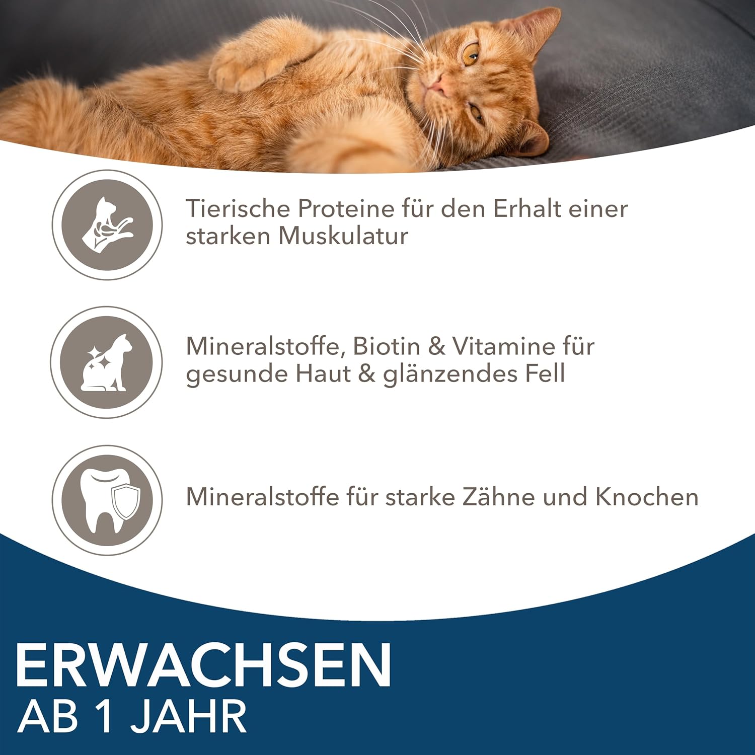 Die hochwertigen tierischen Proteine des Futters fördern den Erhalt starker Muskeln und Taurin unterstützt ein gesundes Herz und die Sehkraft der Katze