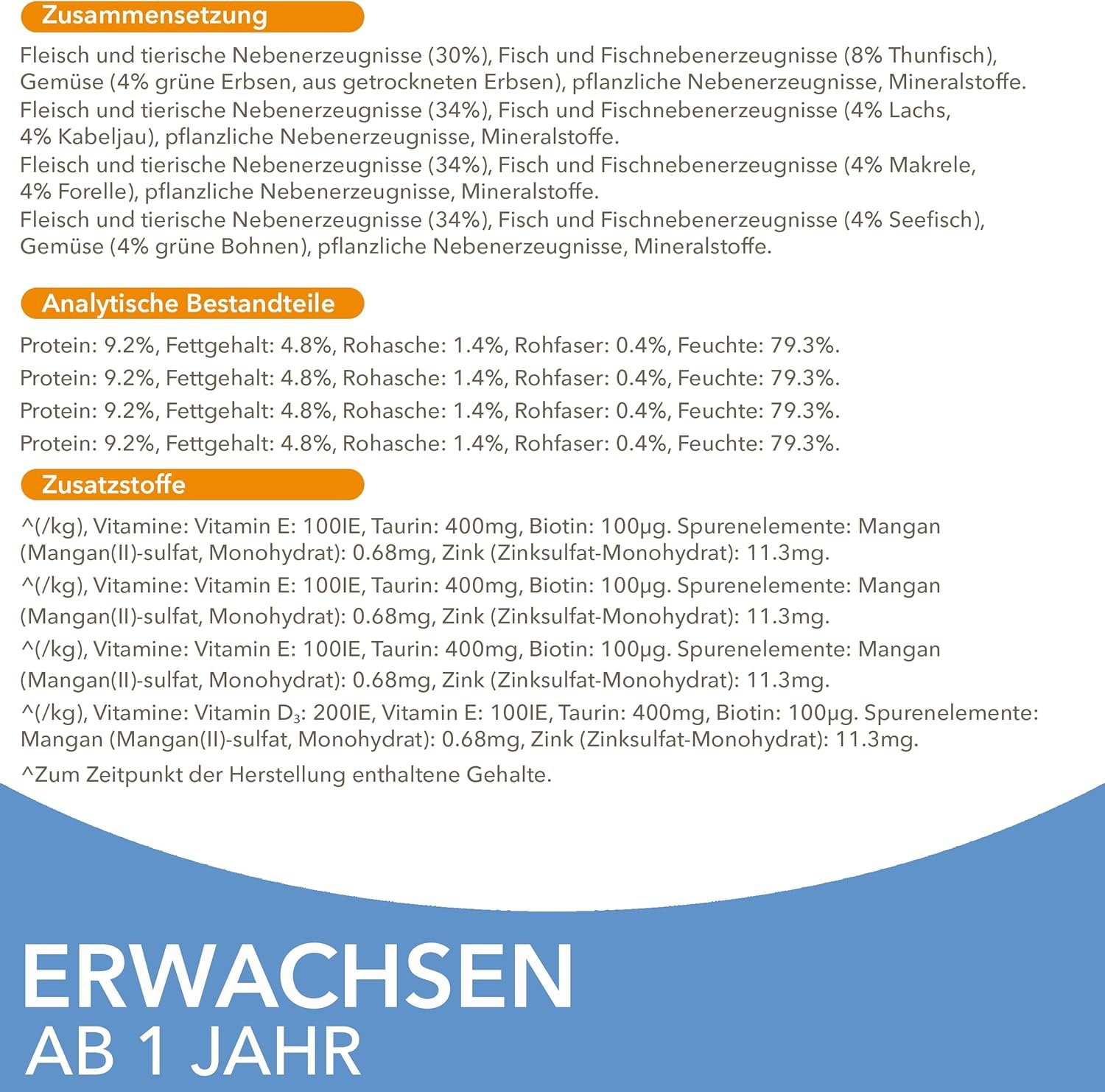 Hochwertiges Nassfutter für Katzen ab 1 Jahr mit vier leckeren Geschmacksrichtungen aus Fisch und Gemüse – ohne künstliche Farb-, Aroma- und Füllstoffe sowie GVO
