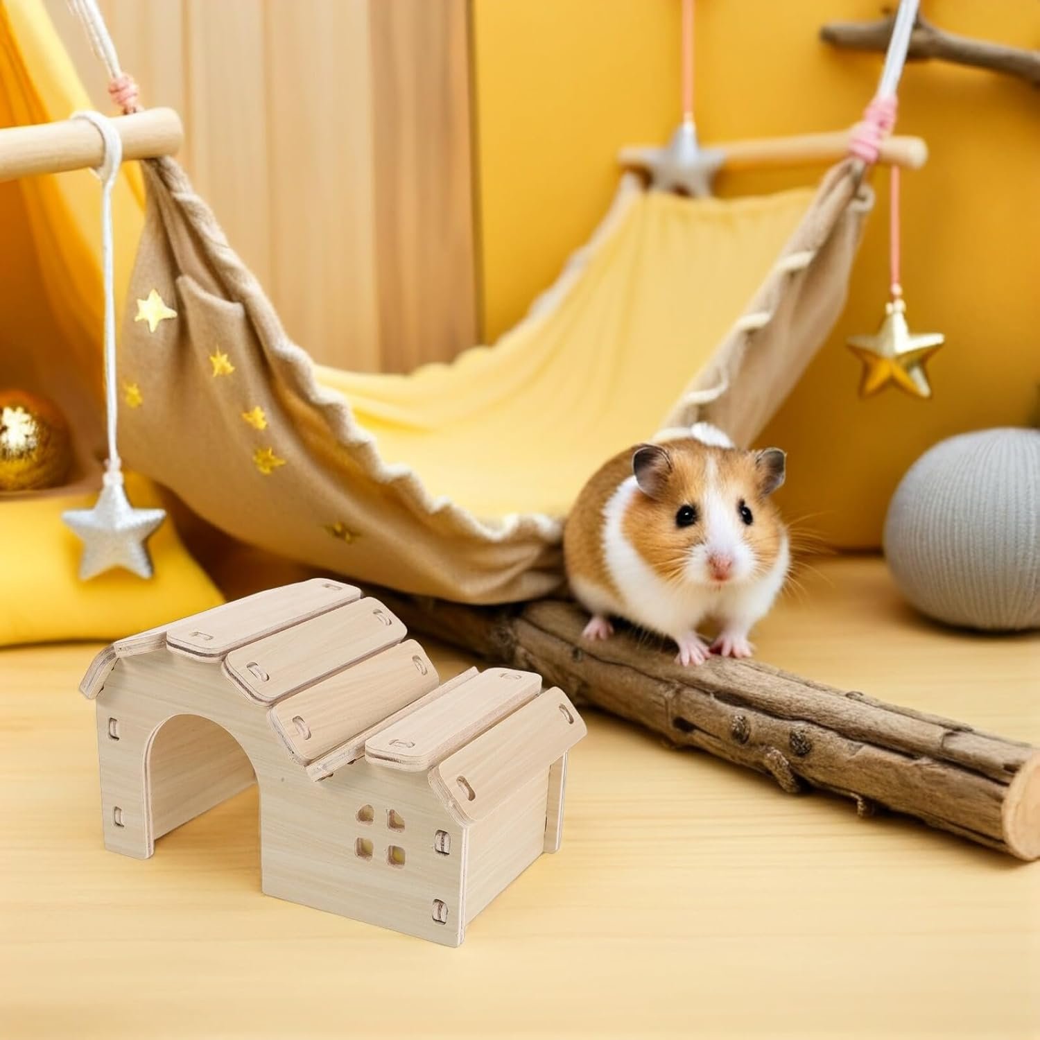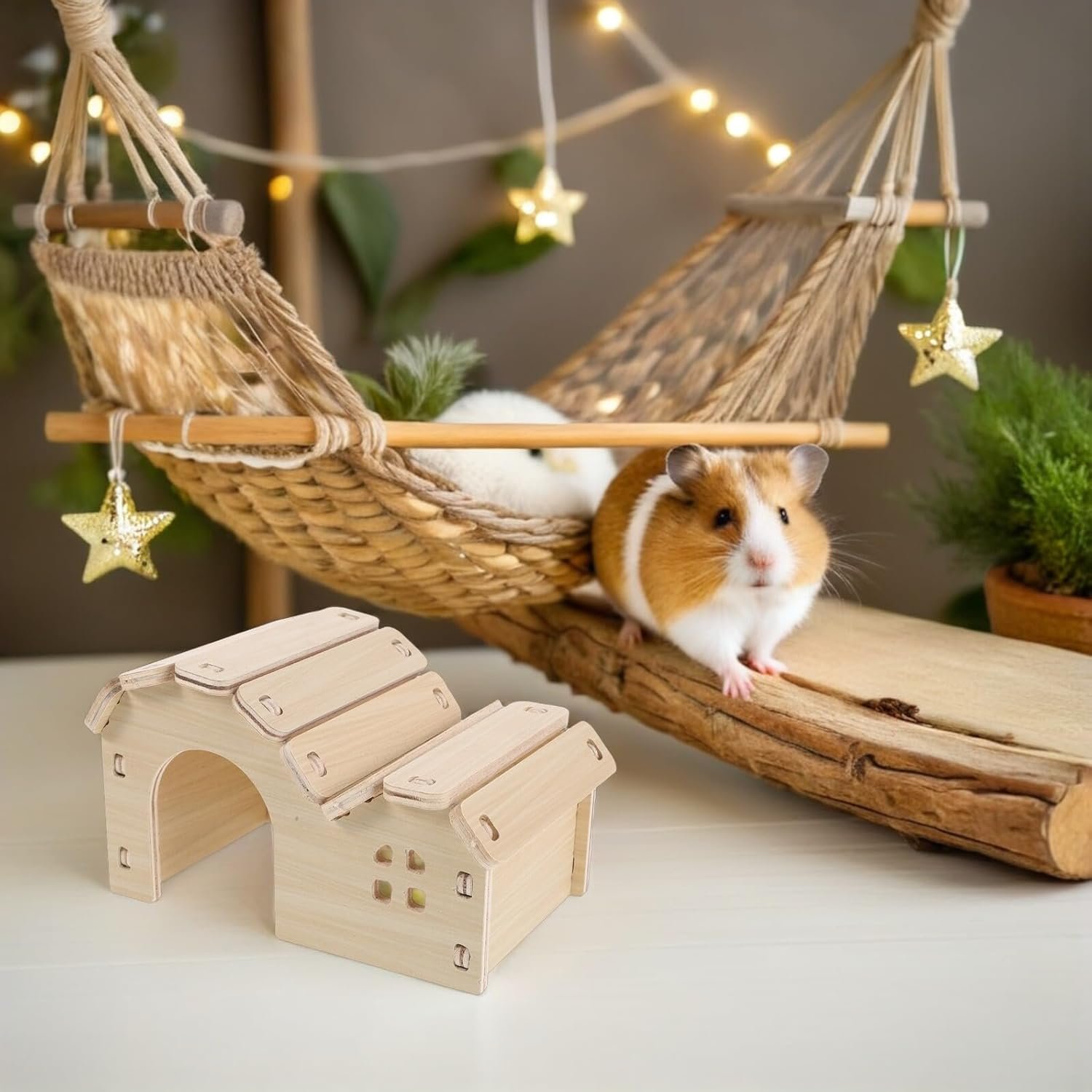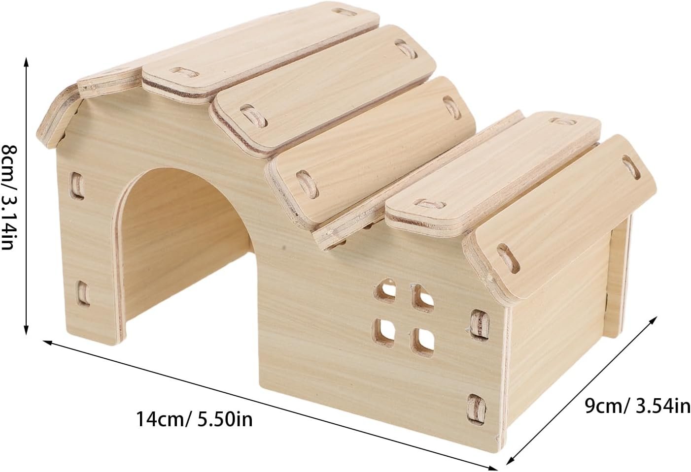 – Hamsterversteck aus Holz: Dieses hölzerne Hamsterhaus dient als kleines Häuschen und Spielbereich und bietet Komfort und Unterhaltung für jeden Hamster.