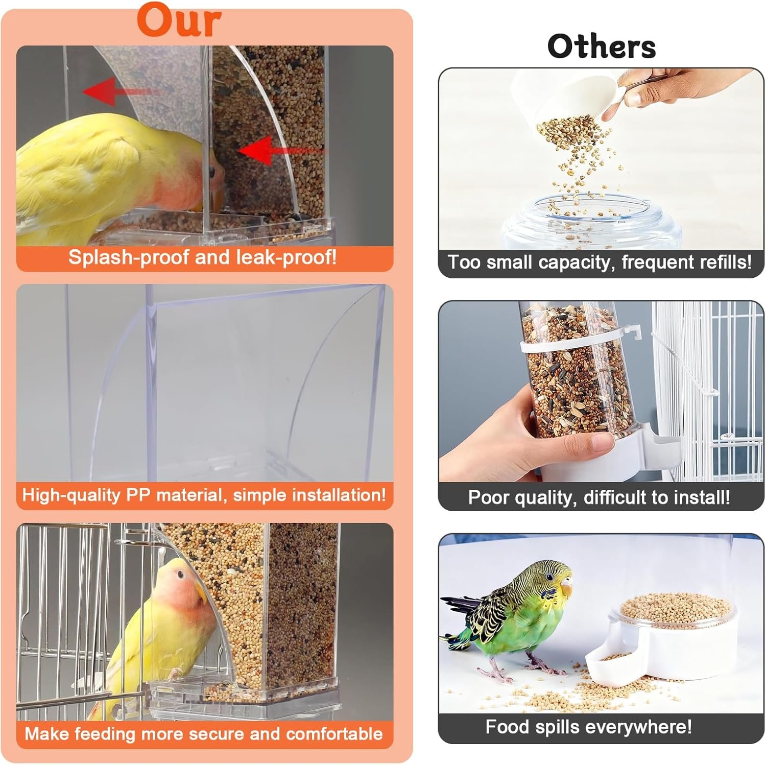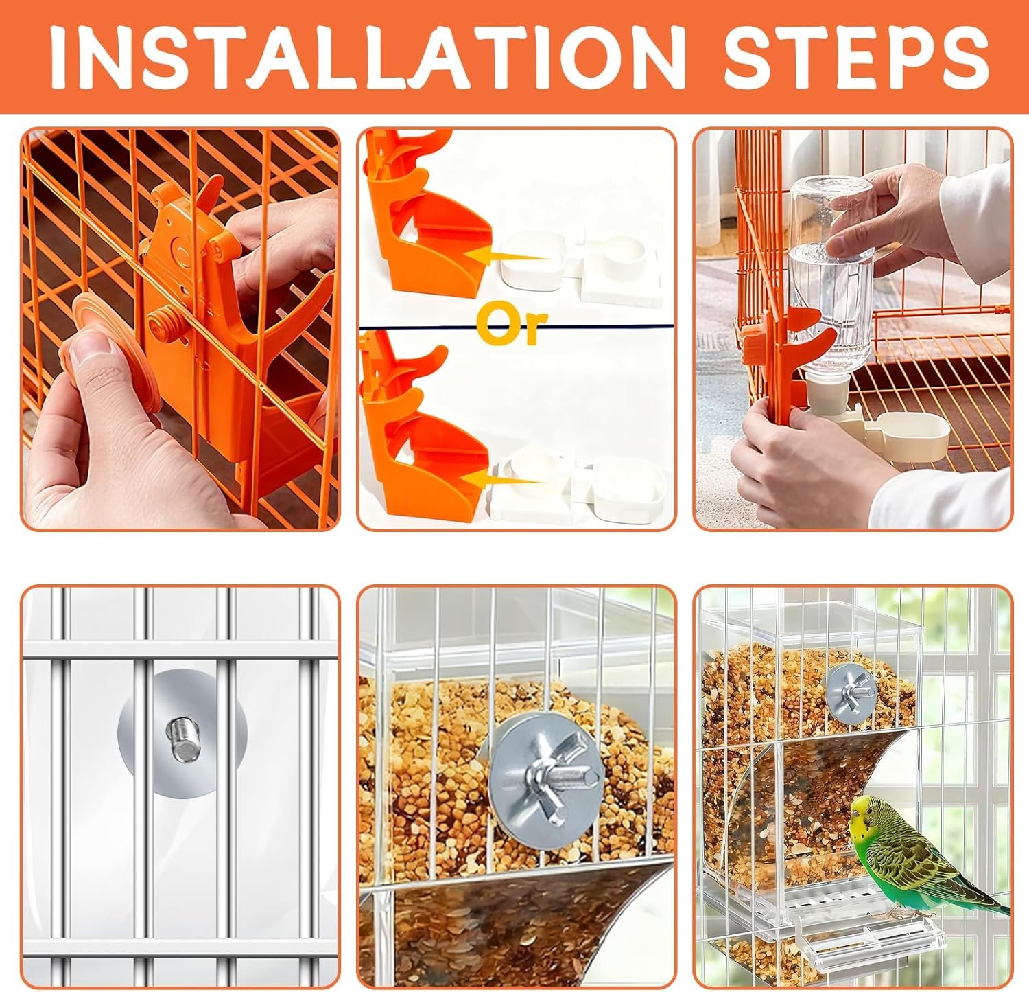 【EINFACHE INSTALLATION】 Die Installation ist unkompliziert: Befestigen Sie den Futterspender mit den mitgelieferten Schrauben sicher an der Außen- oder Innenseite des Käfigs, ohne dass zusätzliches Werkzeug erforderlich ist. Wählen Sie die Montageposition je nach Käfigstruktur und persönlichen Vorlieben und ermöglichen Sie so eine flexible Anpassung an verschiedene Käfigtypen. Das Nachfüllen von Vogelfutter ist mühelos – heben Sie einfach den Deckel an, um schnell und einfach nachzufüllen.