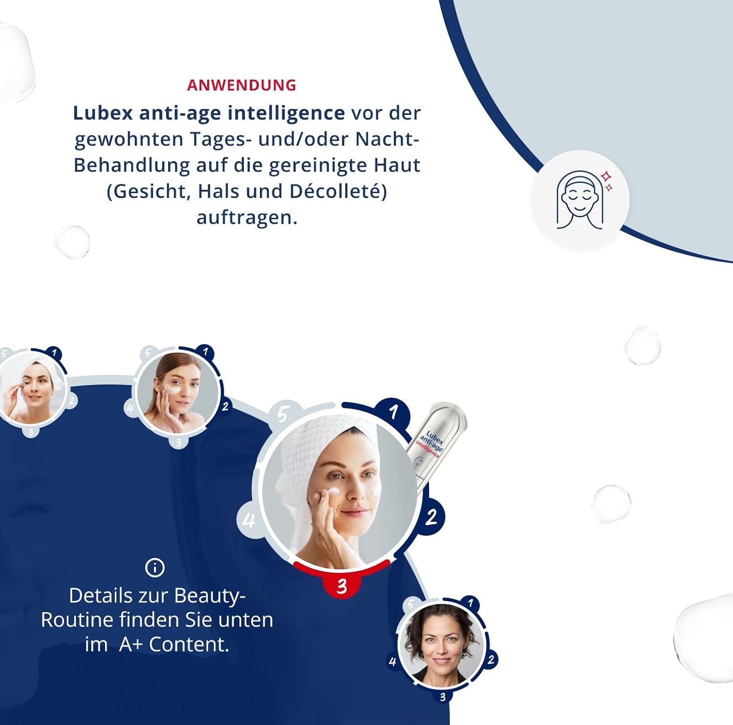 Tägliche Anwendung: Morgens und/oder abends vor der üblichen Tages- oder Nachtbehandlung auf die gereinigte Haut von Gesicht, Hals und Dekolleté auftragen. Für alle Hauttypen geeignet