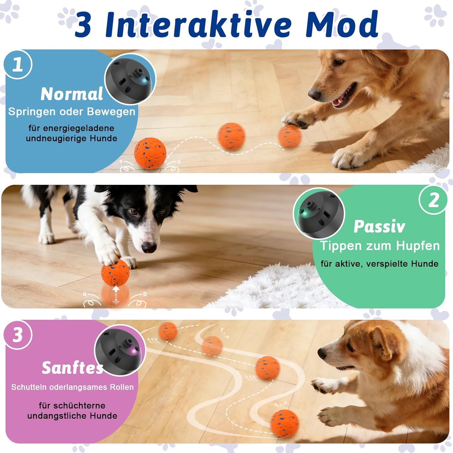 Drei interaktive Modi: „Verrückt“, „Normal“ und „Sanft“. Passen Sie den Modus ganz einfach an die Persönlichkeit und das Energieniveau Ihres Hundes an