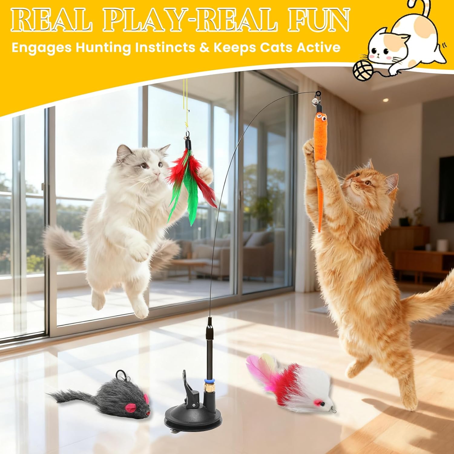 Umfangreiches 12-teiliges Set – Interaktive Katzenangel mit Saugnapf, Federn, Glöckchen, Plüschmaus, Wollknäuel – abwechslungsreiches Katzenspielzeug für Wohnungskatzen, Kätzchen und erwachsene Katzen.