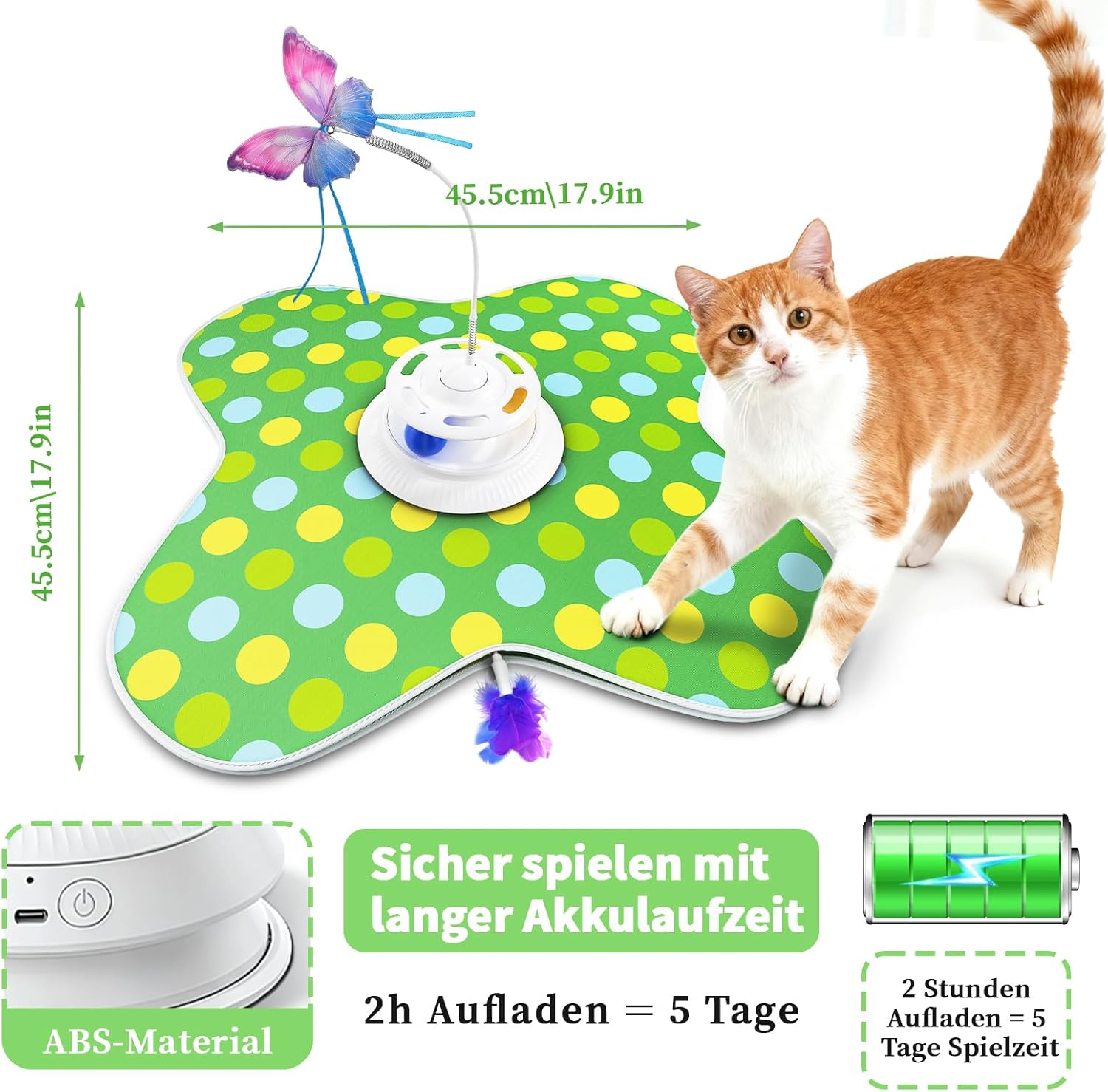 Intelligente Auto-Start-/Stopp-Funktion mit Fernbedienung. Das Katzenspielzeug verfügt über einen automatischen Energiesparmodus nach 10 Minuten Inaktivität. Automatischer Schlafmodus nach 5 Stunden Betrieb. Wenn sich Ihre Katze bewegt, startet sie selbstständig. Inklusive Fernbedienung zur flexiblen Steuerung jedes Raumes. Bis zu 8 Stunden Akkulaufzeit pro Ladung über USB-Kabel. Spart Batteriekosten und gibt Profis die Kontrolle über den Spielplan ihrer Katze