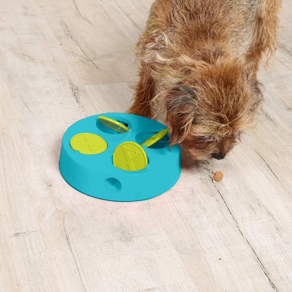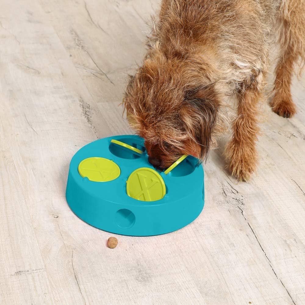 Trainieren Sie Ihr Haustier, um sequentielle Schritte zu lernen. Dieses fortgeschrittene Puzzle-Spielzeug erfordert Hunde, das Panel zu drehen, damit die Leckerlis aus den unteren Löchern herausfliegen. Das helle und auffällige Design verfügt über Anti-Rutsch-Pads an der Basis, und ist besser geeignet für fortgeschrittene und fortgeschrittene Benutzer. Verwenden Sie das liebste Leckerbissen Ihres Haustiers, um es aufregend zum Spielen und Lernen zu bringen.