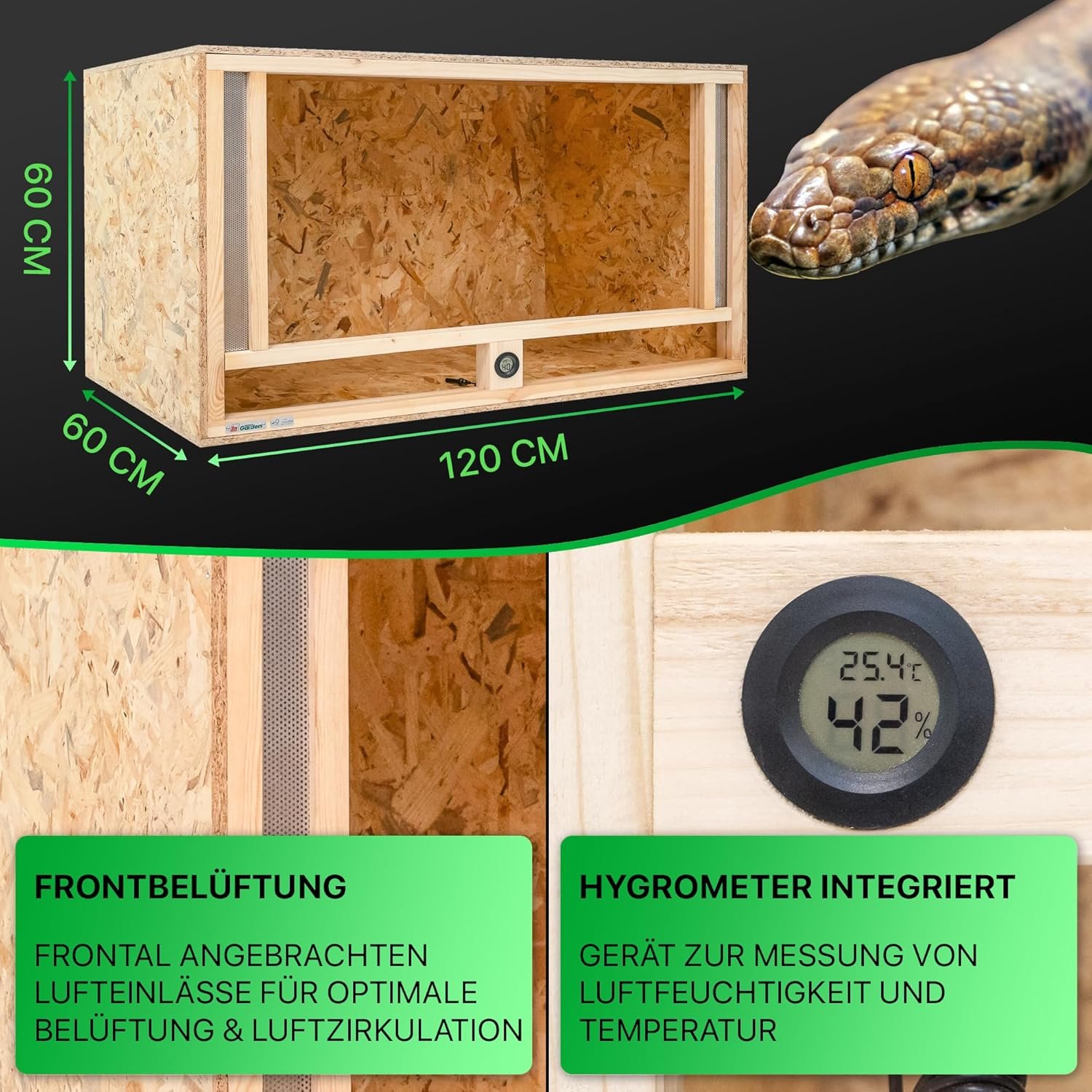 Belüftung und Abmessungen: Die Frontbelüftung (2 Lufteinlässe im Frontrahmen) sorgt für eine optimale Luftzirkulation im Inneren. Mit seinen Maßen von 120 x 60 x 60 cm (Breite x Tiefe x Höhe) bietet das Holzterrarium ausreichend Platz für Tiere wie Schlangen, Spinnen oder Eidechsen