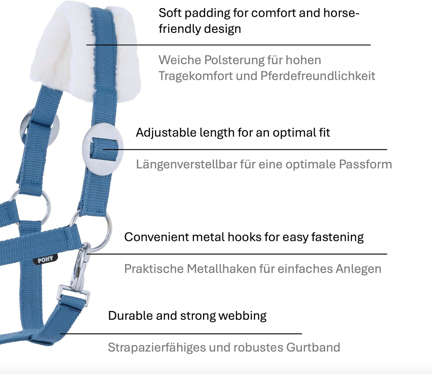 WEICHES KUNSTFELL – Gepolstertes Halfter mit weichem Kunstfell schützt empfindliche Pferdehaut vor Scheuern.