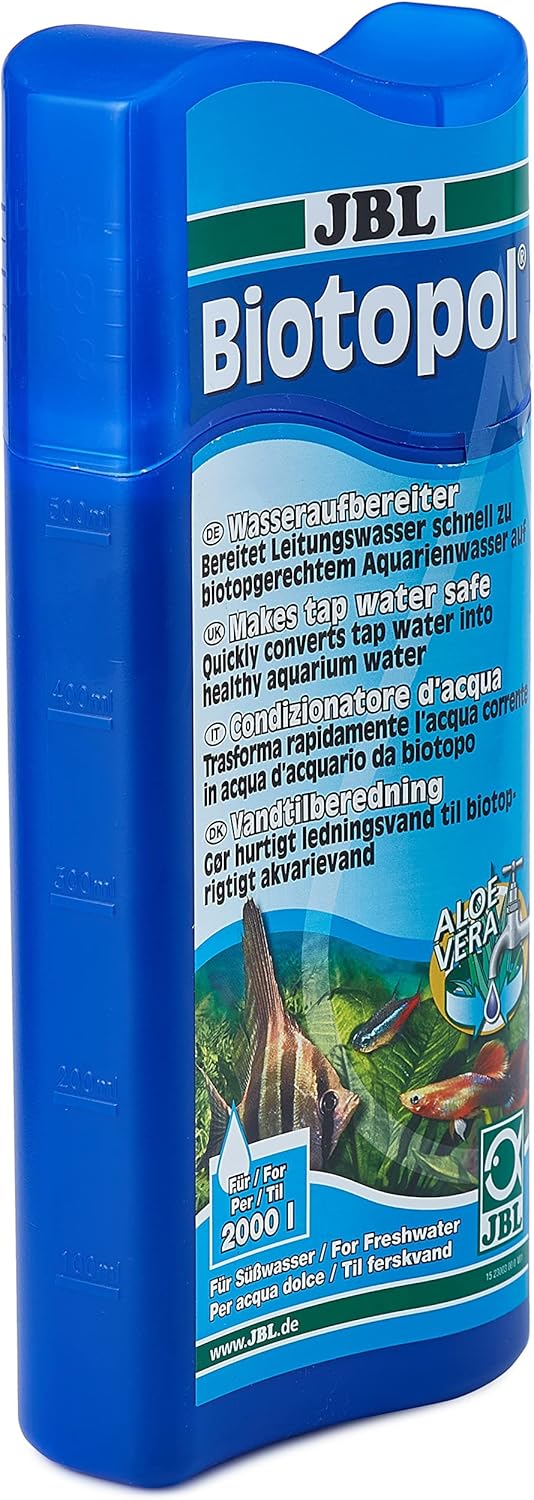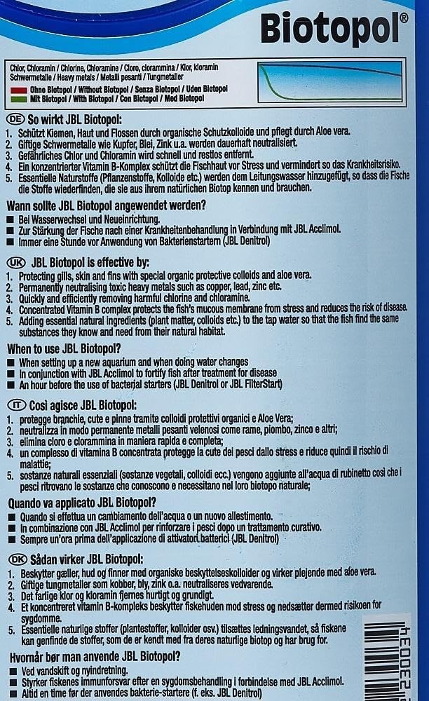 Fish and invertebrates should feel as comfortable in the aquarium as in nature. Prepare the aquarium water in a biotope-appropriate manner and protect the aquarium inhabitants from harmful toxins. Tap water contains heavy metals harmful to fish and invertebrates. JBL Biotopol neutralises copper, zinc and lead and specifically removes chlorine and chloramine from tap water. Essential nutrients are added to the tap water, ensuring a permanently fish-friendly water quality. Furthermore, Biotopol protects the mucous membranes, gills, skin and fins with aloe vera. A concentrated vitamin B complex protects against stress and reduces the risk of disease. To be used for water changes, resetup and to strengthen the fish after disease treatment. Always one hour before use of bacterial starters such as JBL Denitrol