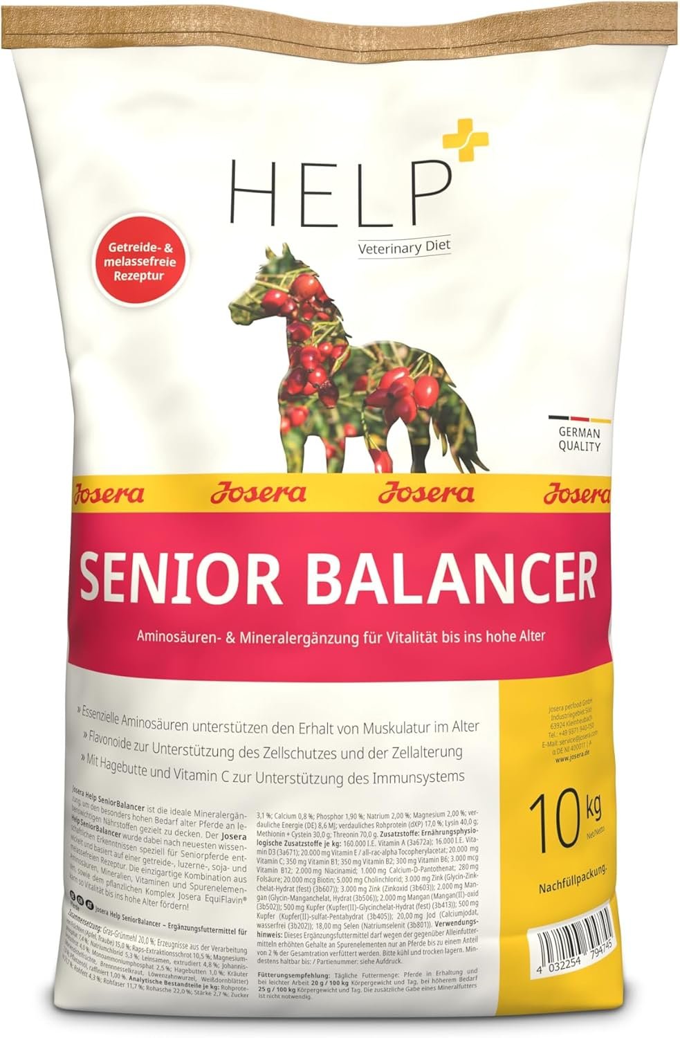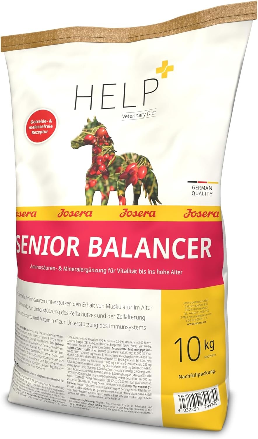 Josera Help SeniorBalancer ist die ideale Mineralstoffergänzung, um gezielt den besonders hohen Bedarf alter Pferde an lebenswichtigen Nährstoffen zu decken. Der Josera Help SeniorBalancer wurde nach neuesten wissenschaftlichen Erkenntnissen speziell für Seniorenpferde entwickelt und basiert auf einer getreide-, luzernen-, soja- und melassefreien Rezeptur. Die einzigartige Kombination aus Aminosäuren, Mineralien, Vitaminen und Spurenelementen sowie dem Pflanzenkomplex Josera EquiFlavin kann die Vitalität bis ins hohe Alter fördern! » Geringe Kalziummineralisierung Wussten Sie, dass eine übermäßige Kalziumaufnahme Harnsteine im Alter begünstigen kann? Deshalb haben wir uns für eine kalziumarme Mineralisierung entschieden, die Ihr alterndes Pferd optimal versorgt. Die essentiellen Aminosäuren Lysin, Threonin, Methionin und Cystein fördern den Erhalt der Muskulatur im Alter. Auch der Bedarf an bestimmten Spurenelementen (z. B. Kupfer und Zink) und Vitaminen (z. B. Vitamin E & C) kann deutlich ansteigen. Der Josera Help SeniorBalancer ist optimal auf die speziellen Anforderungen Ihres Seniors zugeschnitten. Die Kraft der Flavonoide Die ausgewählte Kombination verschiedener Pflanzenprodukte aus Äpfeln, Weintrauben und Oregano (Josera EquiFlavin) enthält zahlreiche sekundäre Inhaltsstoffe, darunter Flavonoide. Diese sind für ihre entzündungshemmenden und antioxidativen Eigenschaften bekannt und können so Entzündungsprozesse und Zellalterung unterstützen. Beruhigende Kräuter und Hagebutten. Traditionelle Kräuter sind aus der Volksmedizin für ihre positiven Eigenschaften bekannt. So kann Weißdorn die Durchblutung fördern und das Herz-Kreislauf-System unterstützen. Die sekundären Inhaltsstoffe der Mariendistel sind für ihre regenerierende Wirkung auf die Leber bekannt und Löwenzahn hat verdauungsfördernde und entwässernde Eigenschaften. Die köstliche und Vitamin C-reiche Hagebutte wird aufgrund ihrer Galaktolipide traditionell auch bei Gelenkbeschwerden und Arthrose eingesetzt.