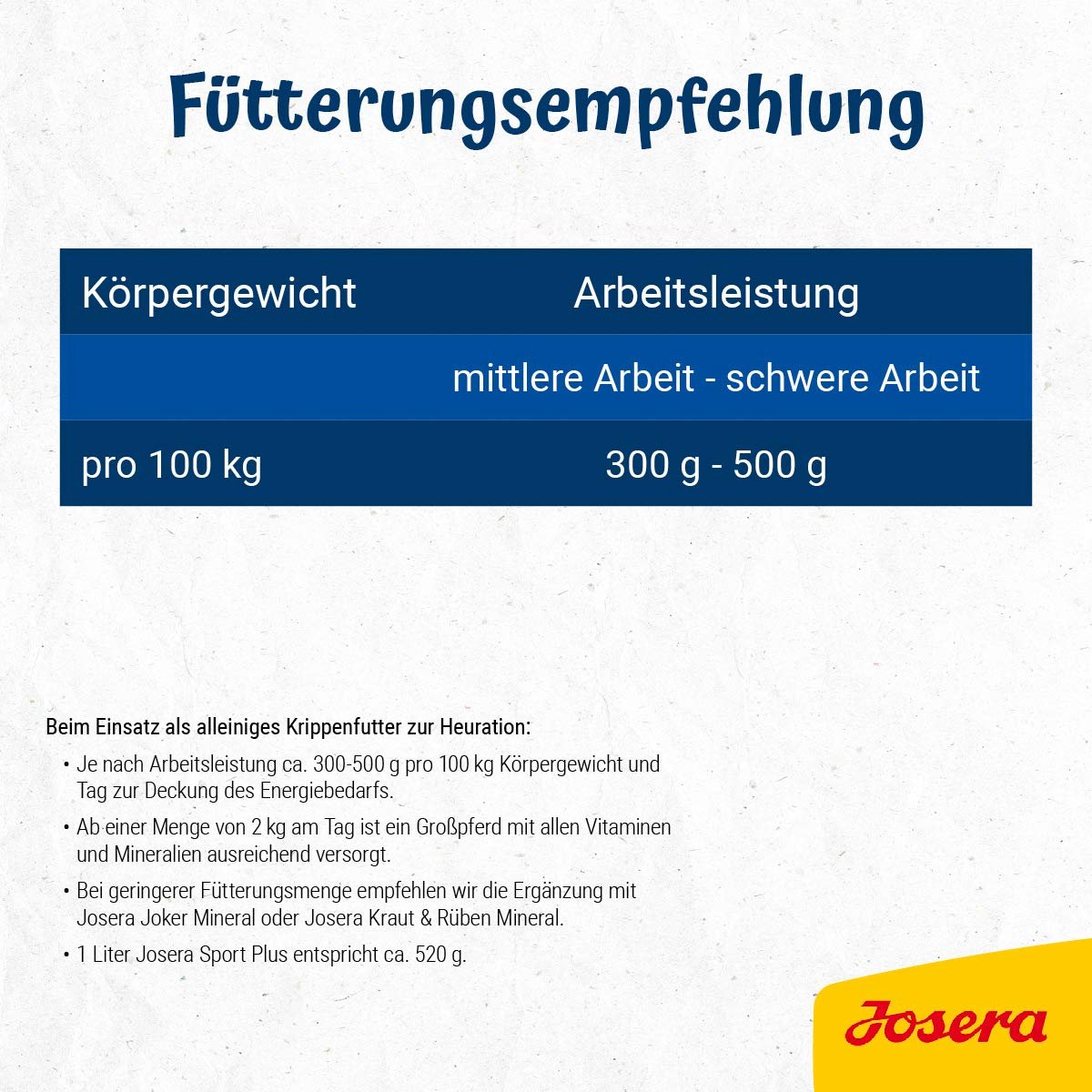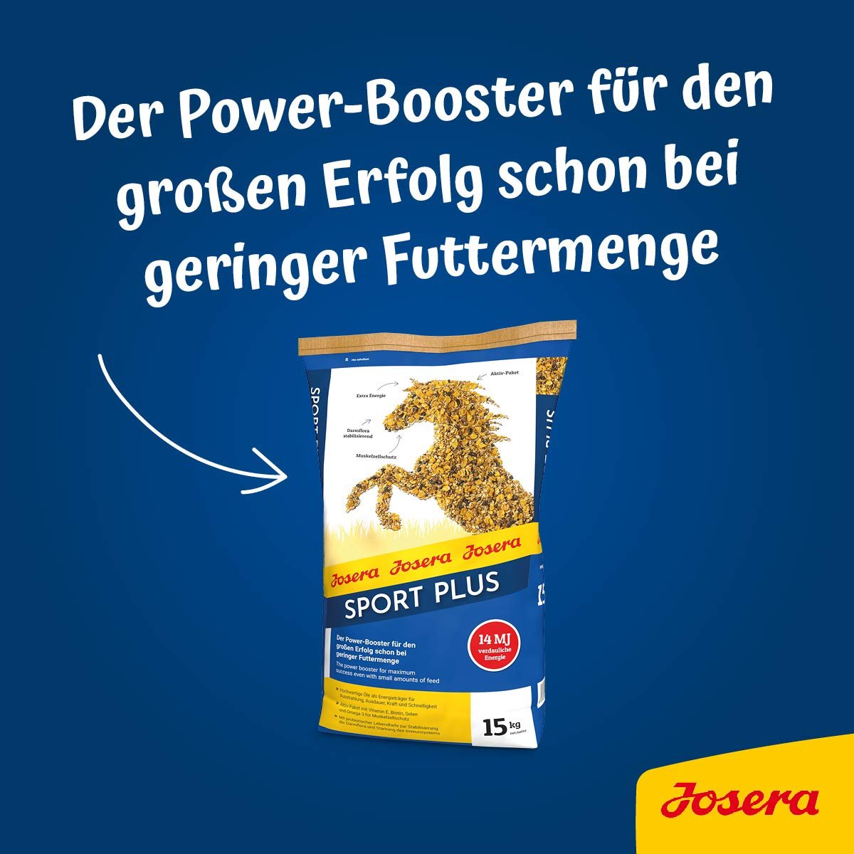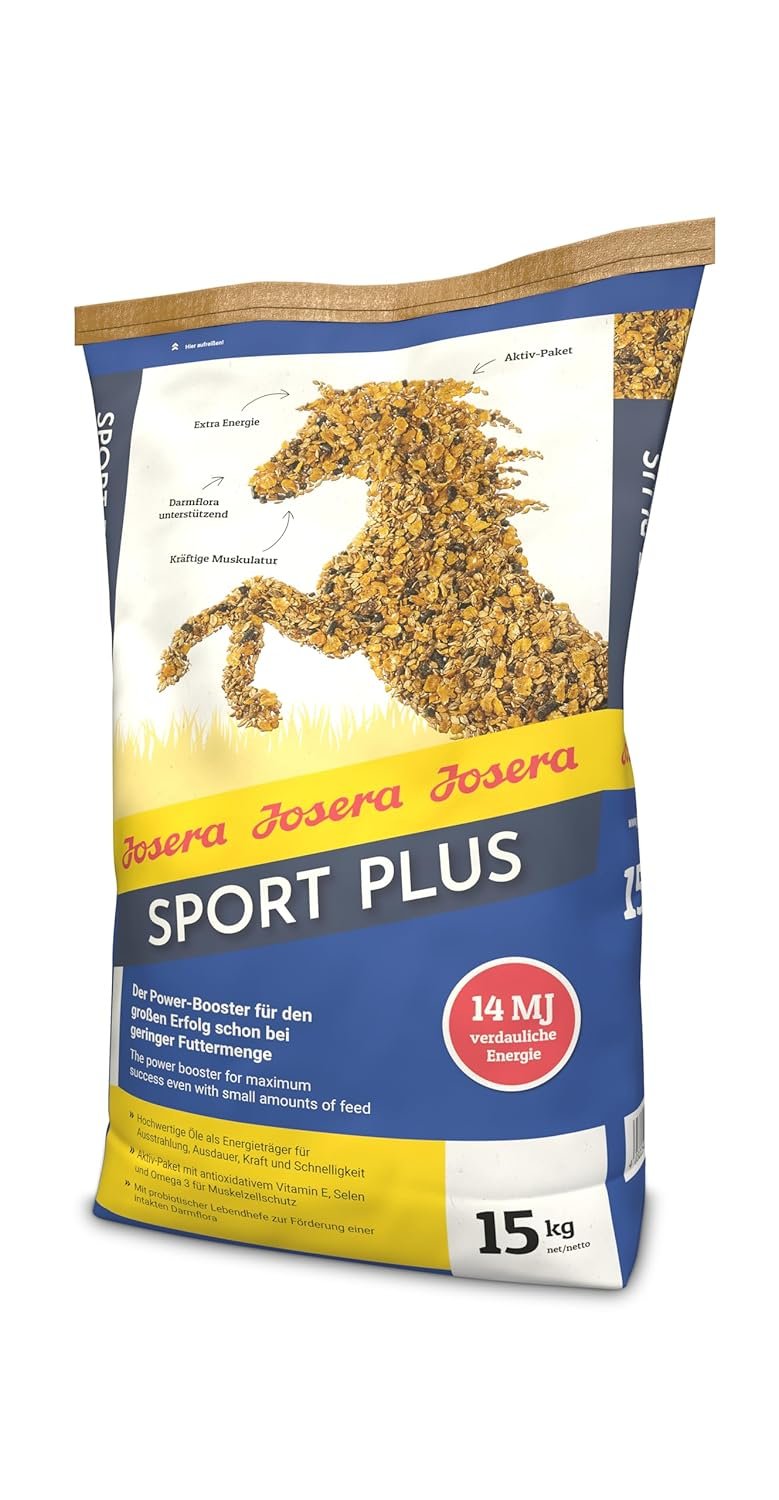 Der Powerbooster für große Erfolge auch bei geringer Futtermenge Josera Sport Plus ist der haferfreie Powerbooster für Pferde aller Disziplinen. Strahlkraft, Ausdauer, Kraft und Schnelligkeit erfordern eine optimale Ernährung des Pferdes. Das hydrothermisch aufgeschlossene Getreide in Josera Sport Plus ist besonders leicht verdaulich und liefert dem Pferd schnell verfügbare Energie. Hochwertige Pflanzenöle hingegen dienen als langfristige und nachhaltige Energiequelle, die insbesondere im Ausdauersport für Ausdauerleistungen sorgen und während der Turniersaison als „Turbo-Boost“ wirken können. Das in Josera Sport Plus enthaltene Aktivpaket mit Vitamin E, Biotin, Selen und Omega-3-Fettsäuren optimiert die Regeneration stark beanspruchter Muskeln. Die in Josera Sport Plus enthaltene probiotische Lebendhefe unterstützt die empfindliche Darmflora aktiver Pferde und reduziert so das Risiko von Verdauungsstörungen. Darüber hinaus schützen Leinsamen und Vitamin A die Darmschleimhaut. Durch die hohe Energiedichte kann die Menge an Krippenfutter gezielt reduziert und der Verdauungstrakt Ihres Pferdes zusätzlich geschont werden. Selbstverständlich ist Josera Sport Plus ADMR-konform. Als Energiebooster lässt sich Josera Sport Plus perfekt mit dem Sportmüsli Josera Aktiv 2.0 kombinieren. Für Phasen besonders intensiver Belastung oder mit besonders hohem Energiebedarf empfehlen wir, 1/3 der Josera Aktiv 2.0-Ration durch Josera Sport Plus zu ersetzen oder die Ration damit zu ergänzen. Fragen Sie unsere Experten!