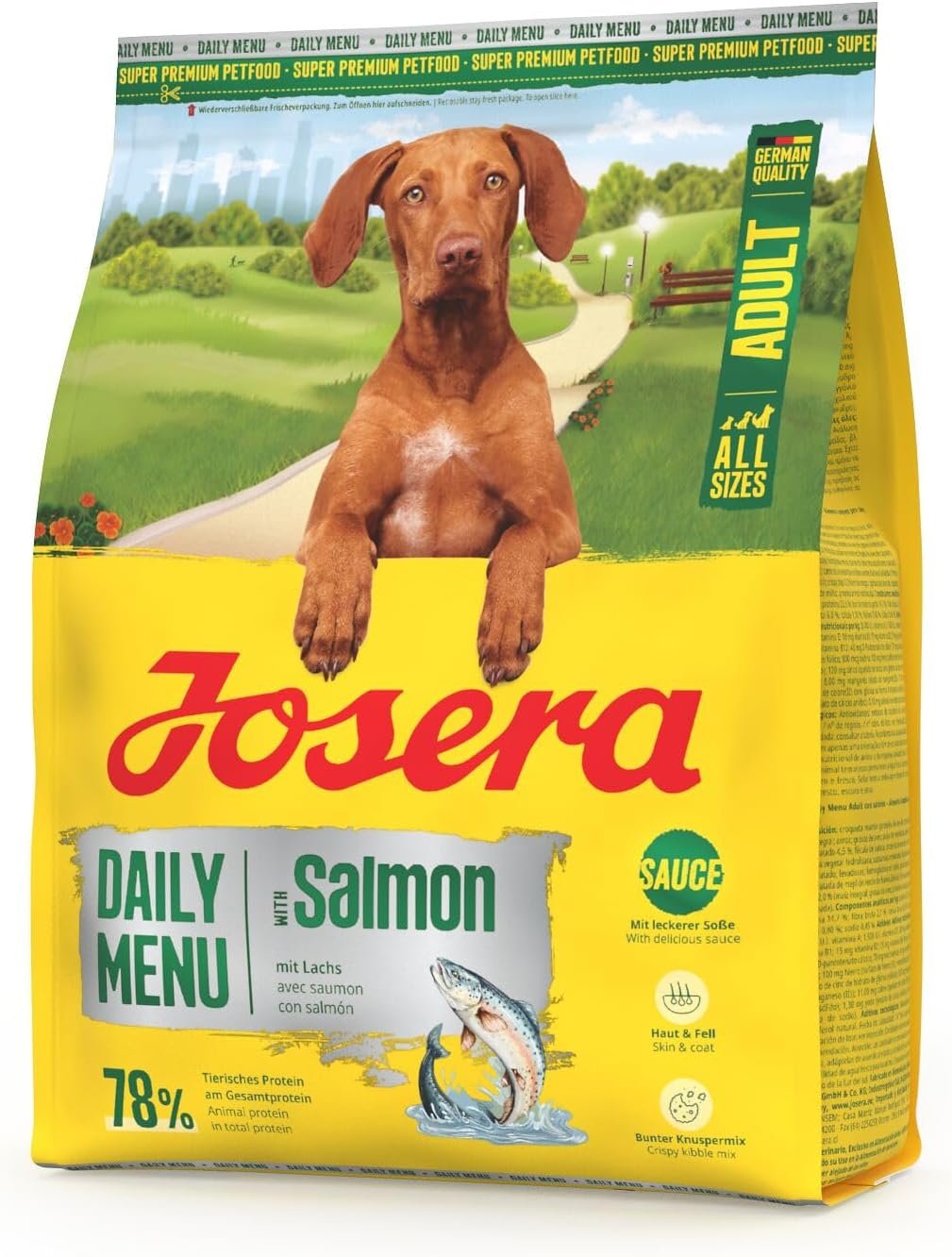 So bunt, so knackig, so lecker: Unser Josera Daily Menu Lachs bringt einen zweifarbigen Krokettenmix mit, der für Abwechslung in der Schüssel sorgt. Abgerundet wird die glutenfreie Rezeptur des Hundefutters für ausgewachsene Hunde mit köstlichem Lachs. Und jetzt das Beste: Durch die Zugabe von Wasser wird aus dem Soßenpulver eine leckere Soße! Das ist besonders bei wählerischen Hunden der Fall. Natürlich kann das Hundefutter mit Soße auch mehr als täglich schmecken. Denn wertvolle Vitamine, L-Carnitin und Taurin unterstützen schöne Haut und glänzendes Fell sowie Gelenke und Knochen. Was denken Sie: Könnte Daily Menu Lachs das neue Lieblingsessen für die tägliche Schüsselfüllung sein? Alleinfuttermittel für ausgewachsene Hunde
