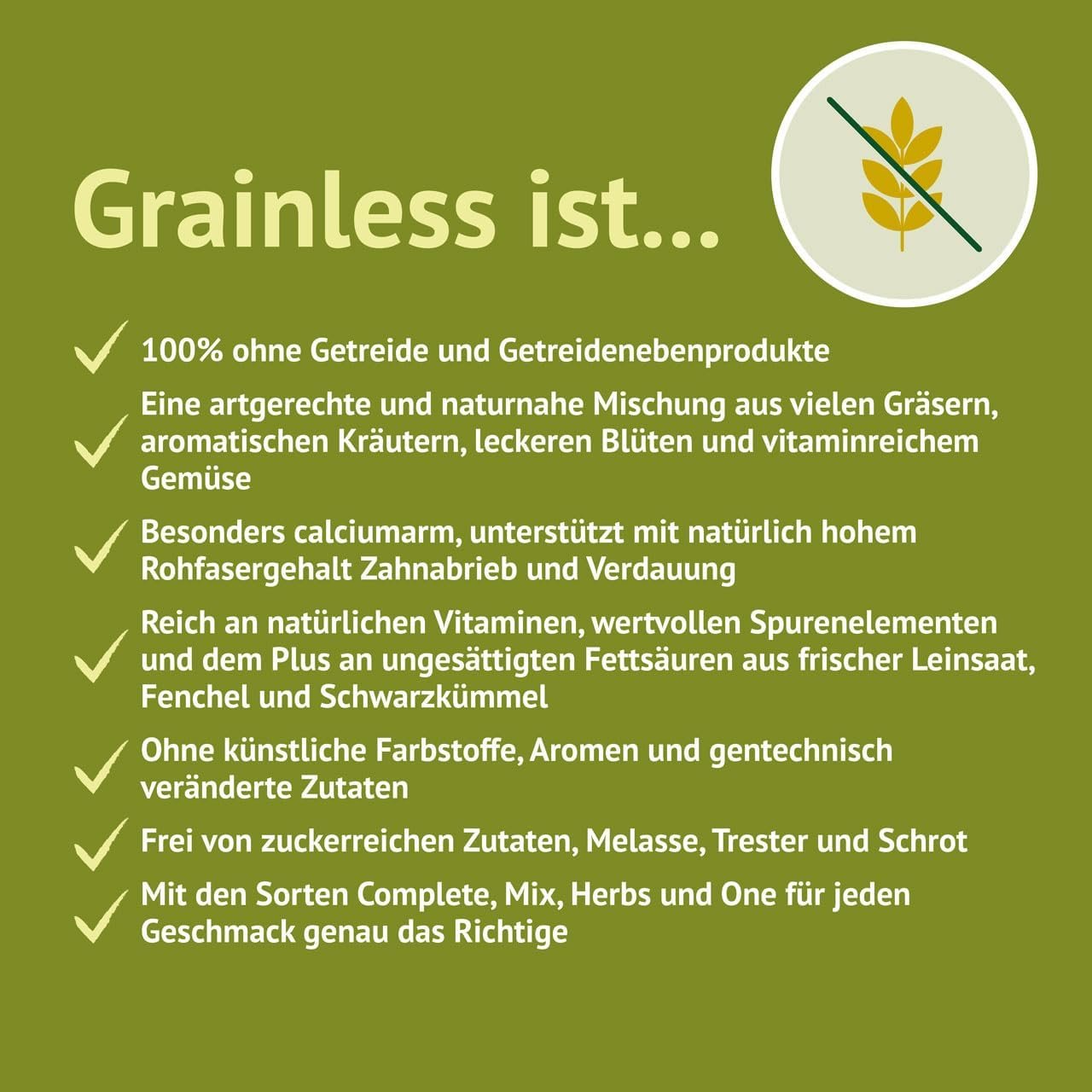 Rein natürlich – besteht zu 100 % aus schonend gepressten Quaderstückchen, die die Futterselektion durch das Tier verhindern.