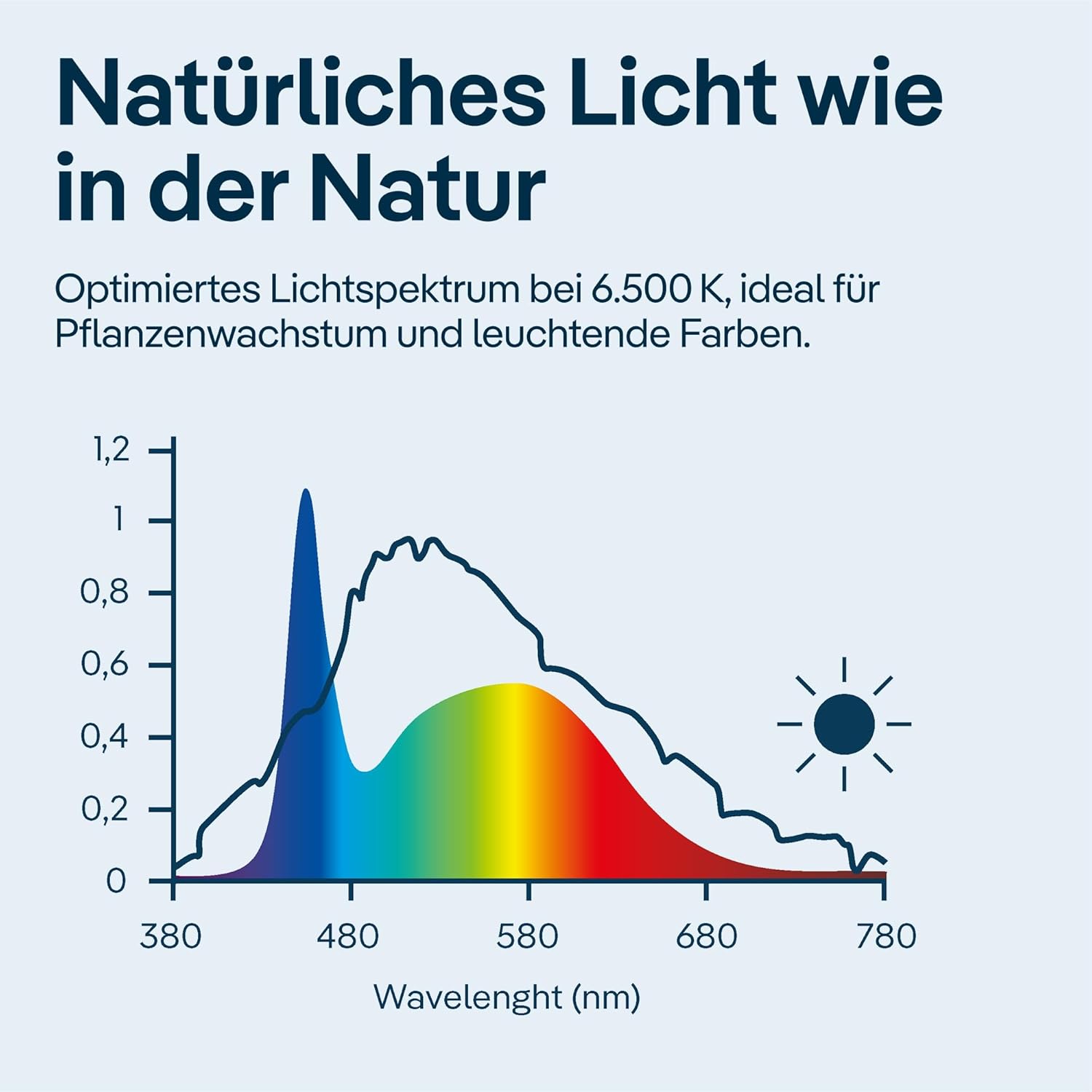 Tageslichtweißes Lichtspektrum mit 6500 K für gesunde Pflanzen und vitale Fische. Die ausgewogene Lichtverteilung sorgt für natürliche Farben, unterstützt das Pflanzenwachstum und bringt die Farbenvielfalt Ihrer Aquarienbewohner zur Geltung.