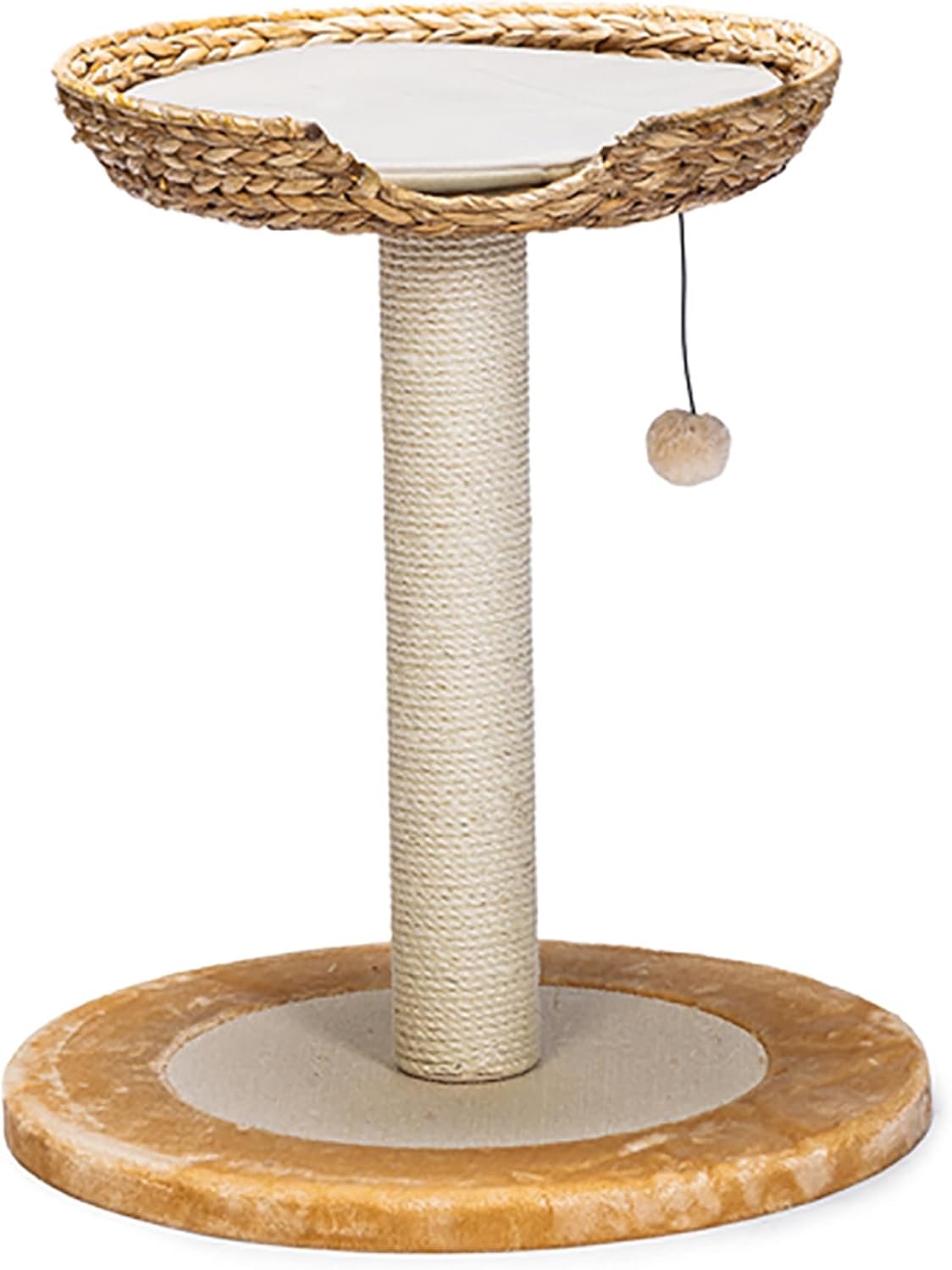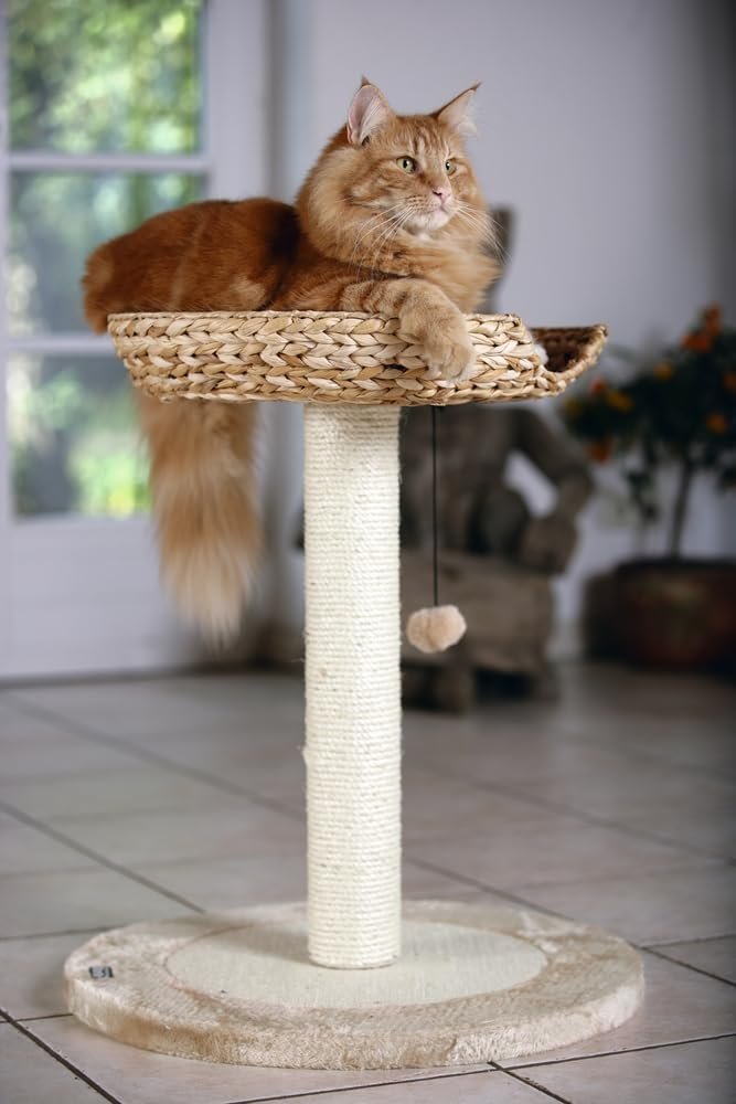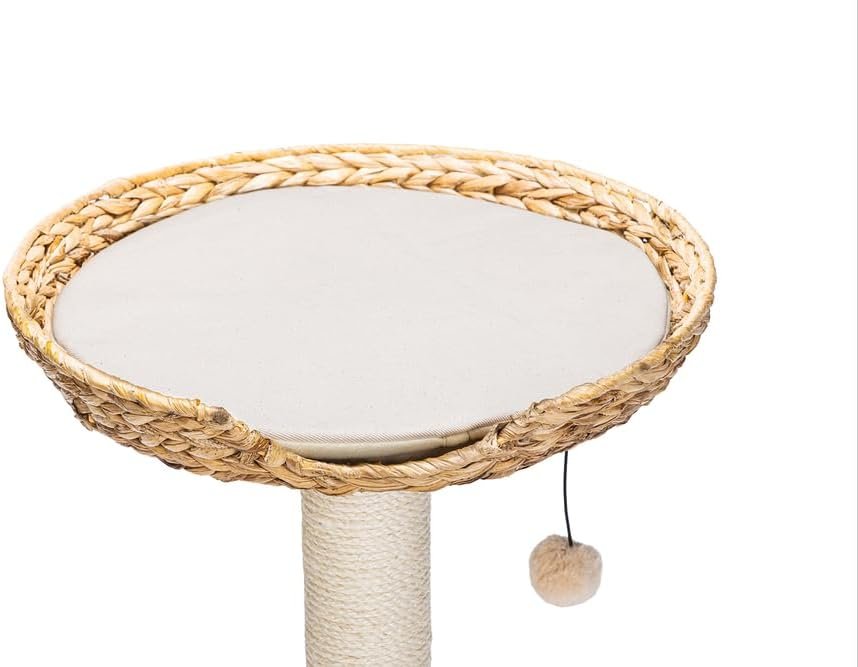 Der Karlie Kratzbaum Banana Leaf I ist ein kompaktes Kratzmöbel im trendigen Design. Die Kombination aus Schlafplatz und Kratzbaum bietet Katzen nicht nur die Möglichkeit, an einer robusten Sisalsäule ihre Krallen zu wetzen, sondern bietet ihnen auch einen gemütlichen Rückzugsort. Das mit einem Kissen ausgestattete Bett besteht aus geflochtenen Bananenblättern. Dies verleiht den Möbeln eine besondere Optik. Die runde Bodenplatte ist mit Sisal und Plüsch bezogen. Für einen angenehmen Zeitvertreib sorgt zudem ein an der Liegefläche befestigtes Spielzeug.