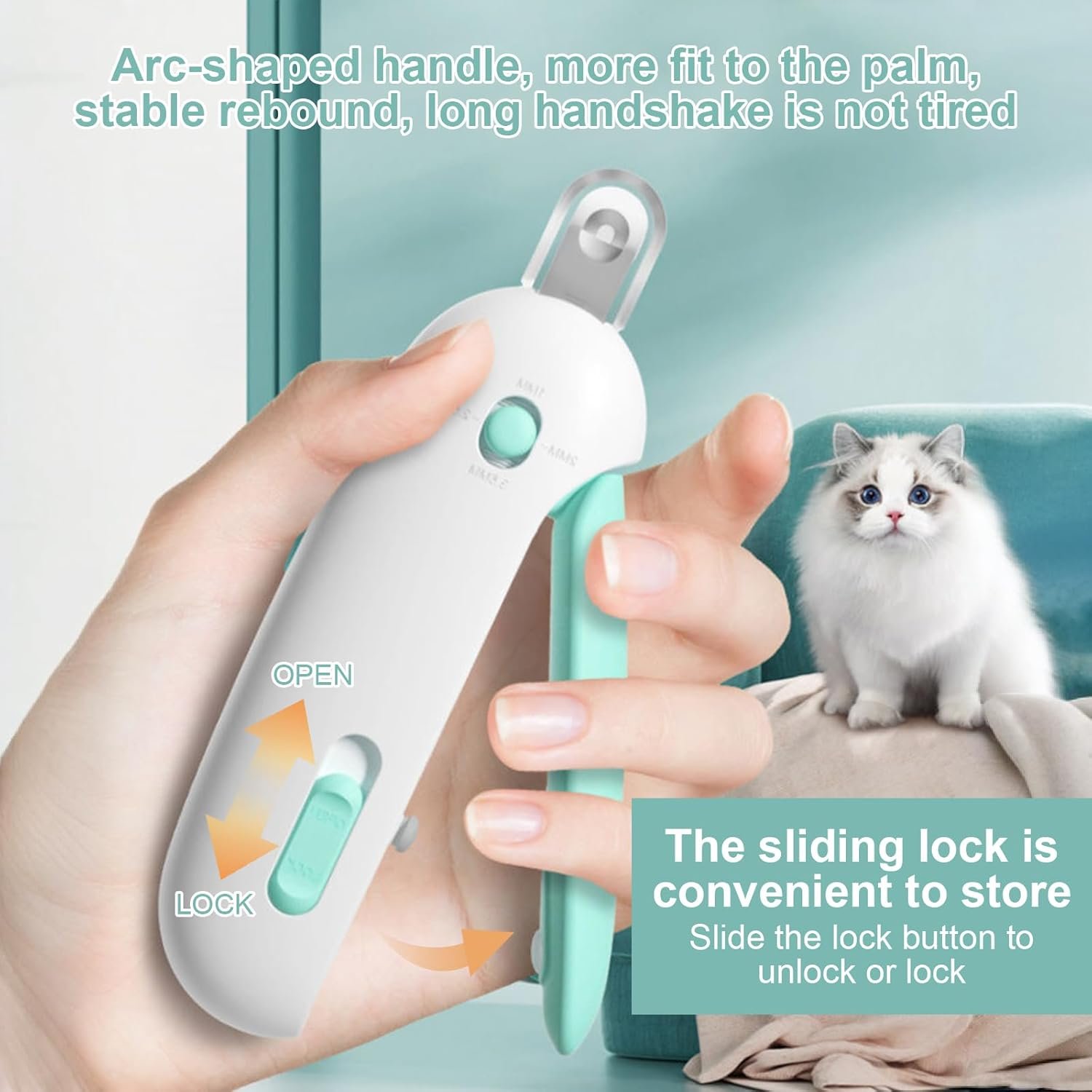 Hochwertige Materialien und ergonomisches Griffdesign: Der Griff von Cat Claw Cutter besteht aus hochwertigem ABS + TB-Material und bietet eine raffinierte und rutschfeste Leistung. Der Griff des Katzenkrallenschneiders ist ergonomisch gestaltet und enthält hochelastische Federn, die das Schneiden der Krallen einfacher und müheloser machen.