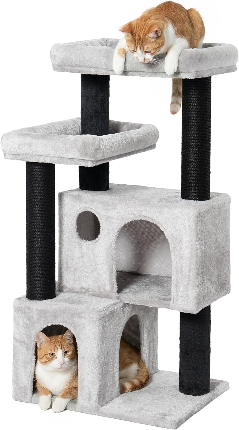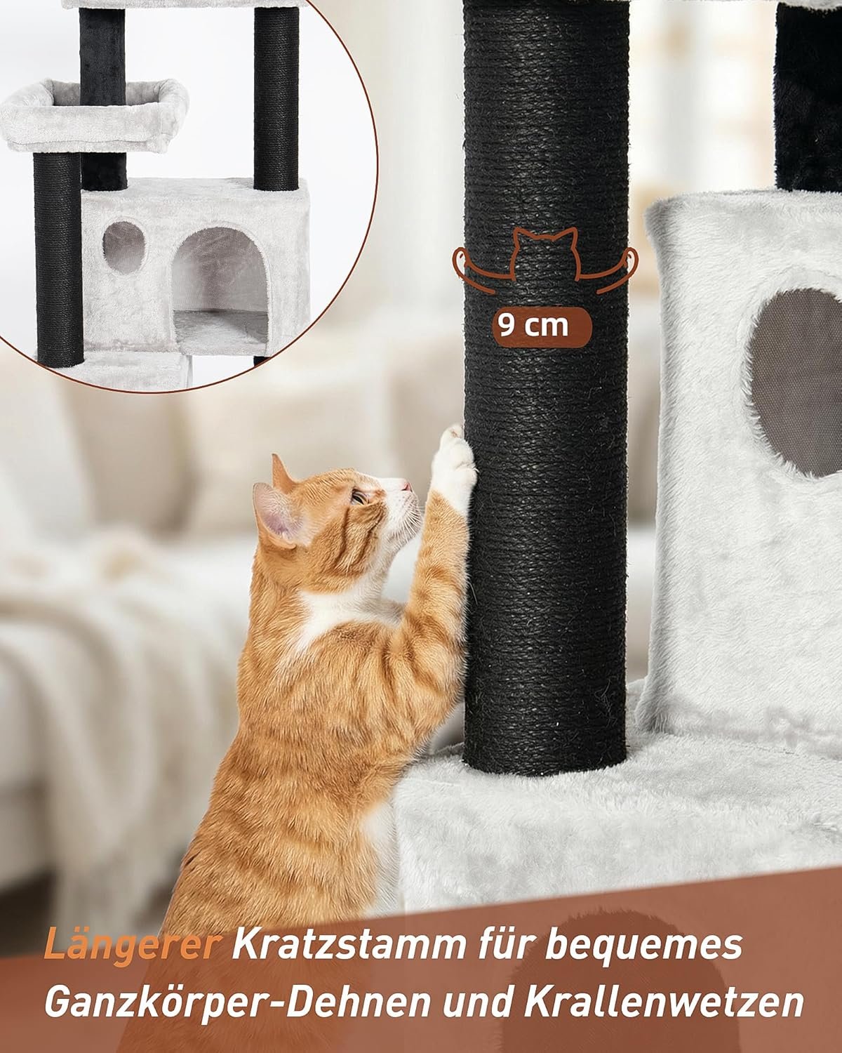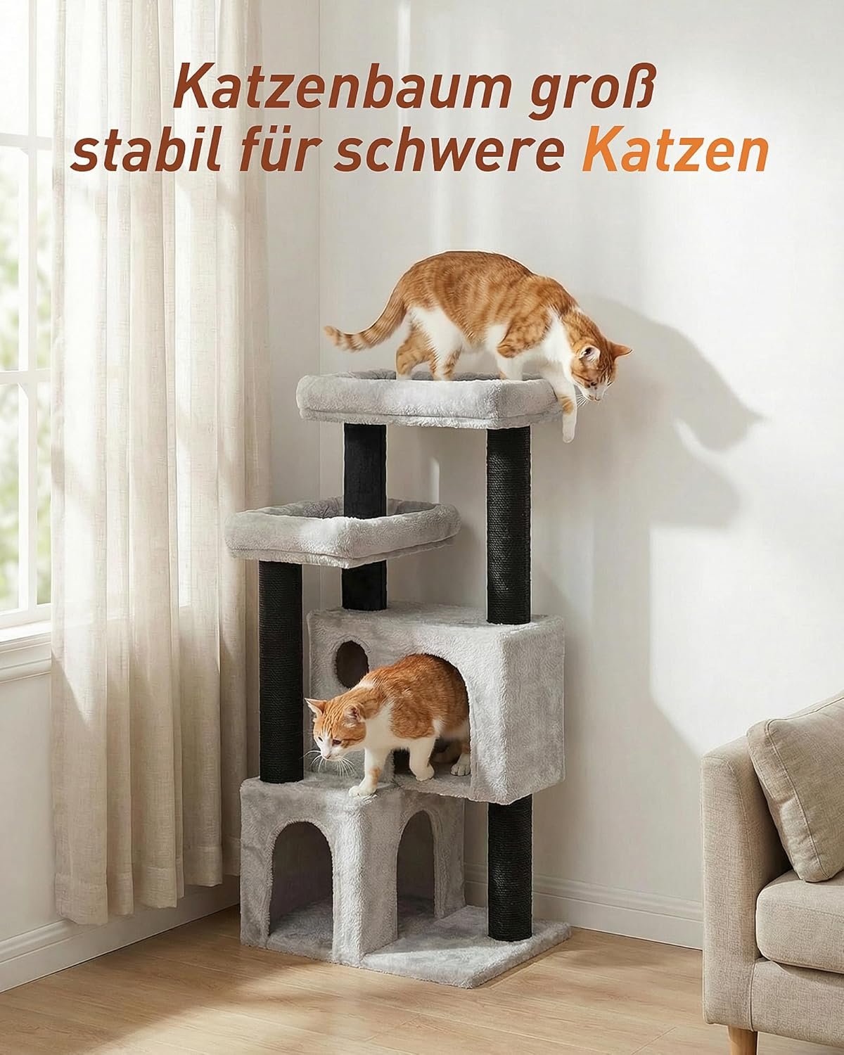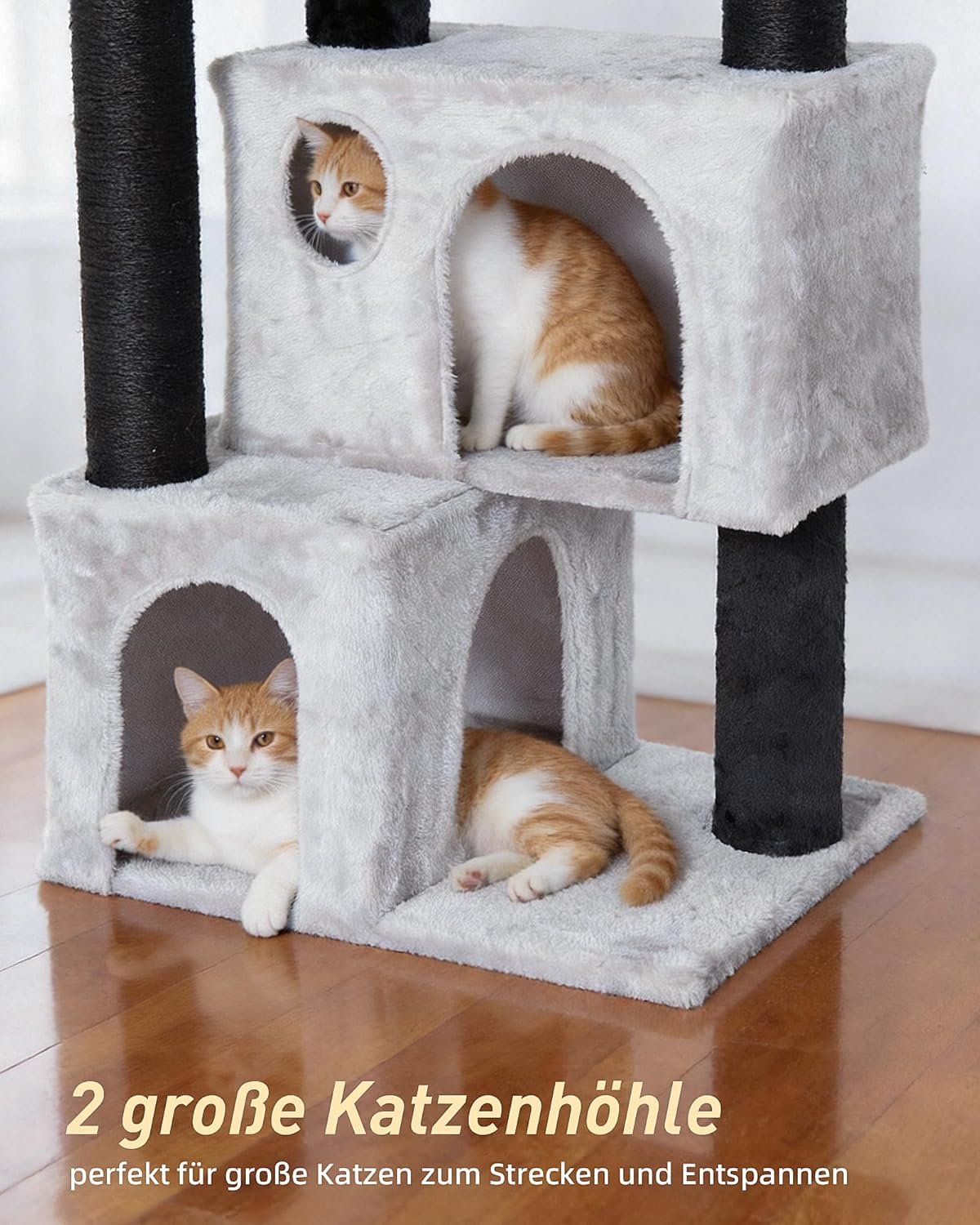 2 extra hohe Kratzbäume (45 cm und 40 cm): mit Juteseil umwickelt – ideal zum Krallenwetzen und Ganzkörperdehnen, perfekt auch für große Katzen.