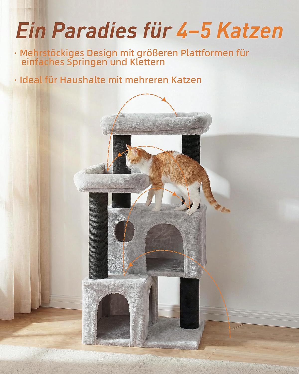 Katzenkletterbaum 4 Ebenen: große Trittstufen & sinnvolle Kletterroute – einfacher Auf- und Abstieg, mehr Sicherheit im Alltag.