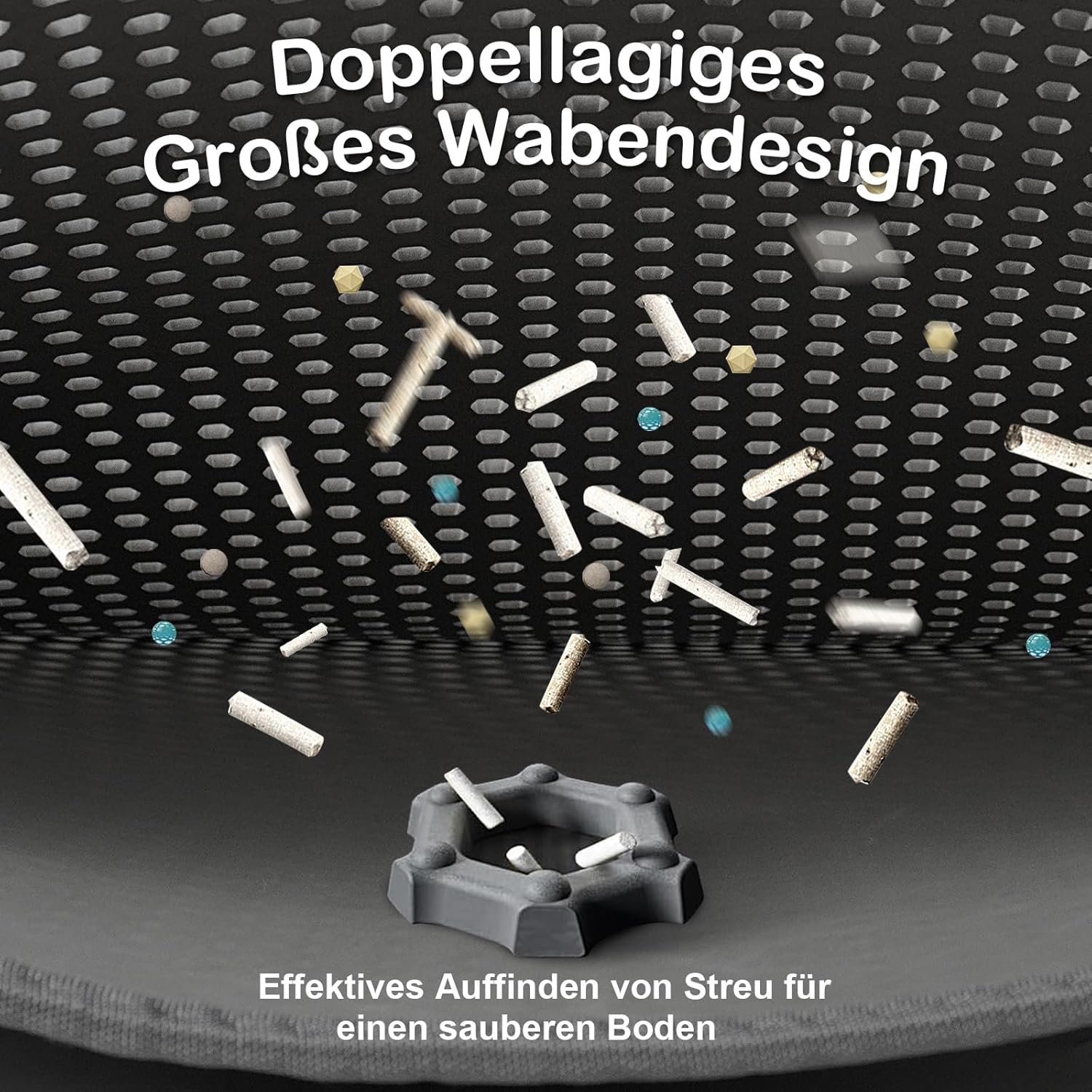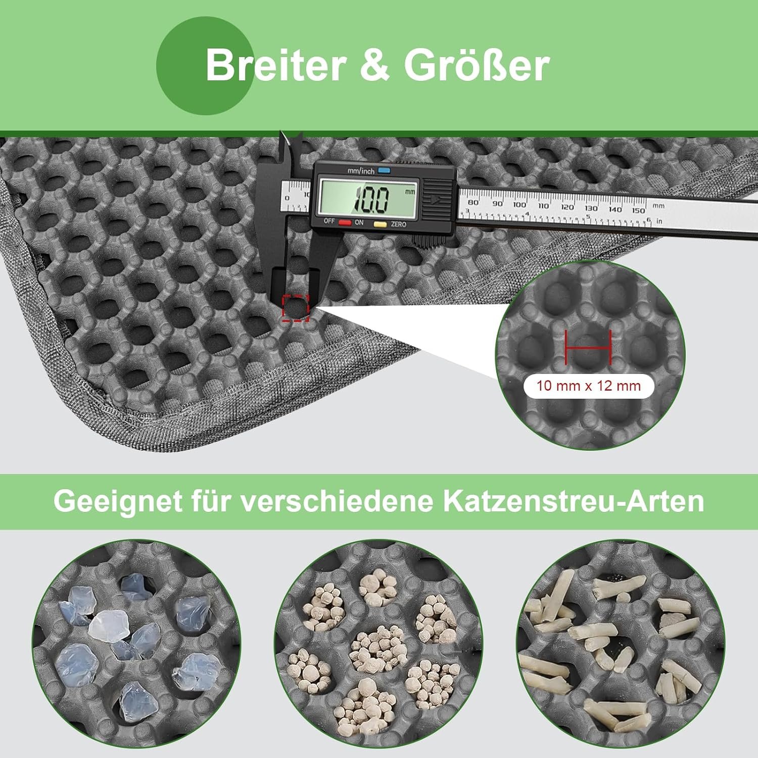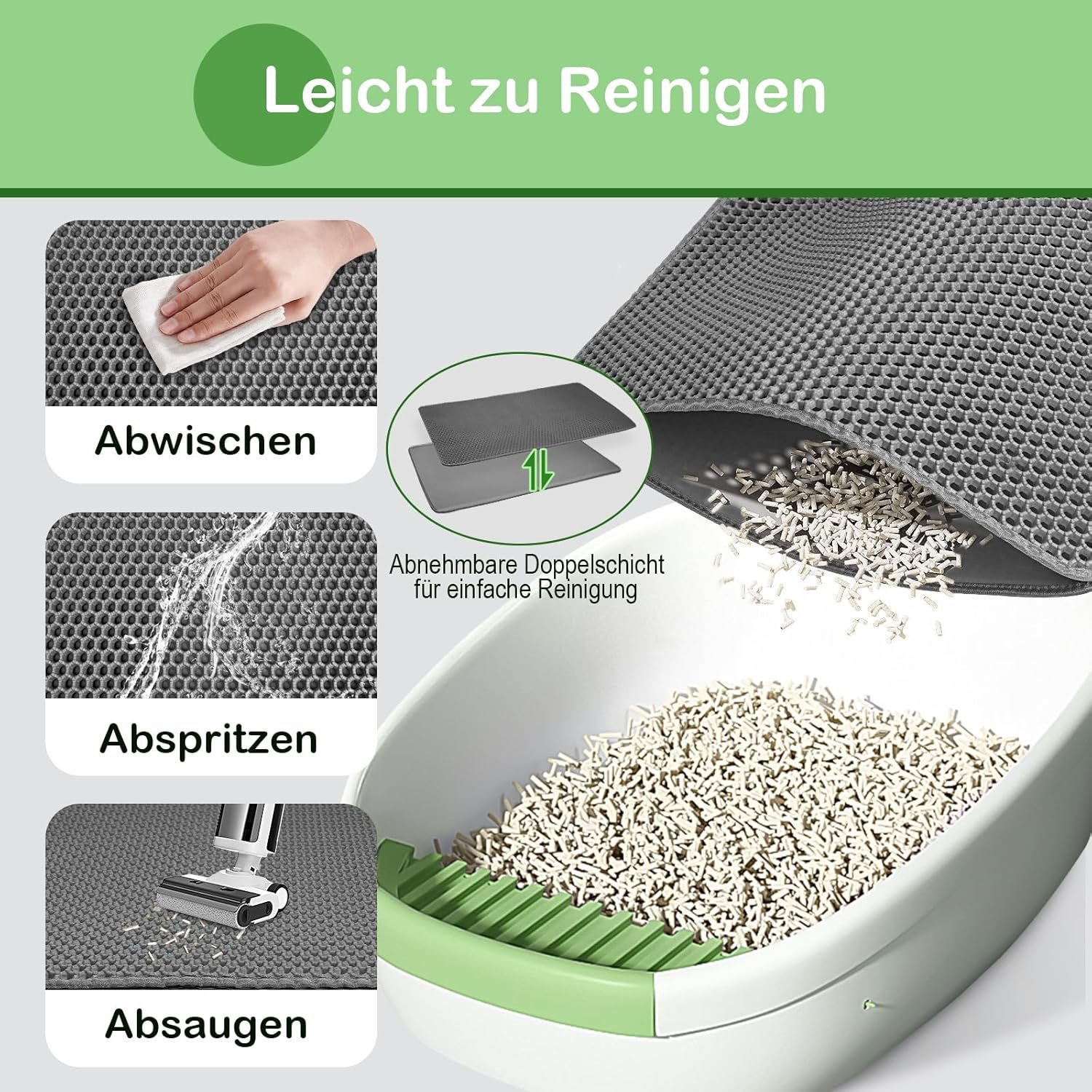 INNOVATIVES DOPPELSCHICHT-DESIGN Die obere Schicht mit einem 12 x 10 mm großen Wabengitter kratzt Katzenstreu aus den Zwischenräumen zwischen den Pfoten der Katze und sammelt sie auf. Die untere Schicht ist eine versiegelte, wasserdichte Hülle, die Sand auffängt und Flüssigkeiten zu 100 % zurückhält. Doppelte Sicherheit, die Schäden durch Katzenstreu, Urin oder versehentliches Verschütten auf dem Boden vollständig verhindert.