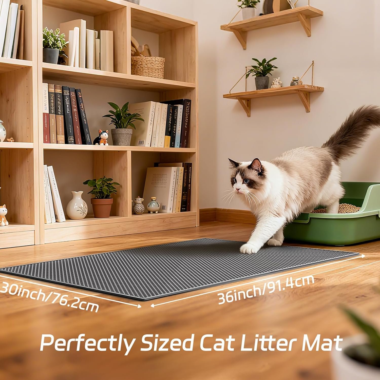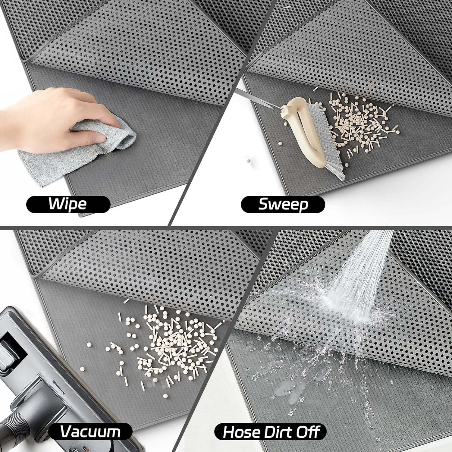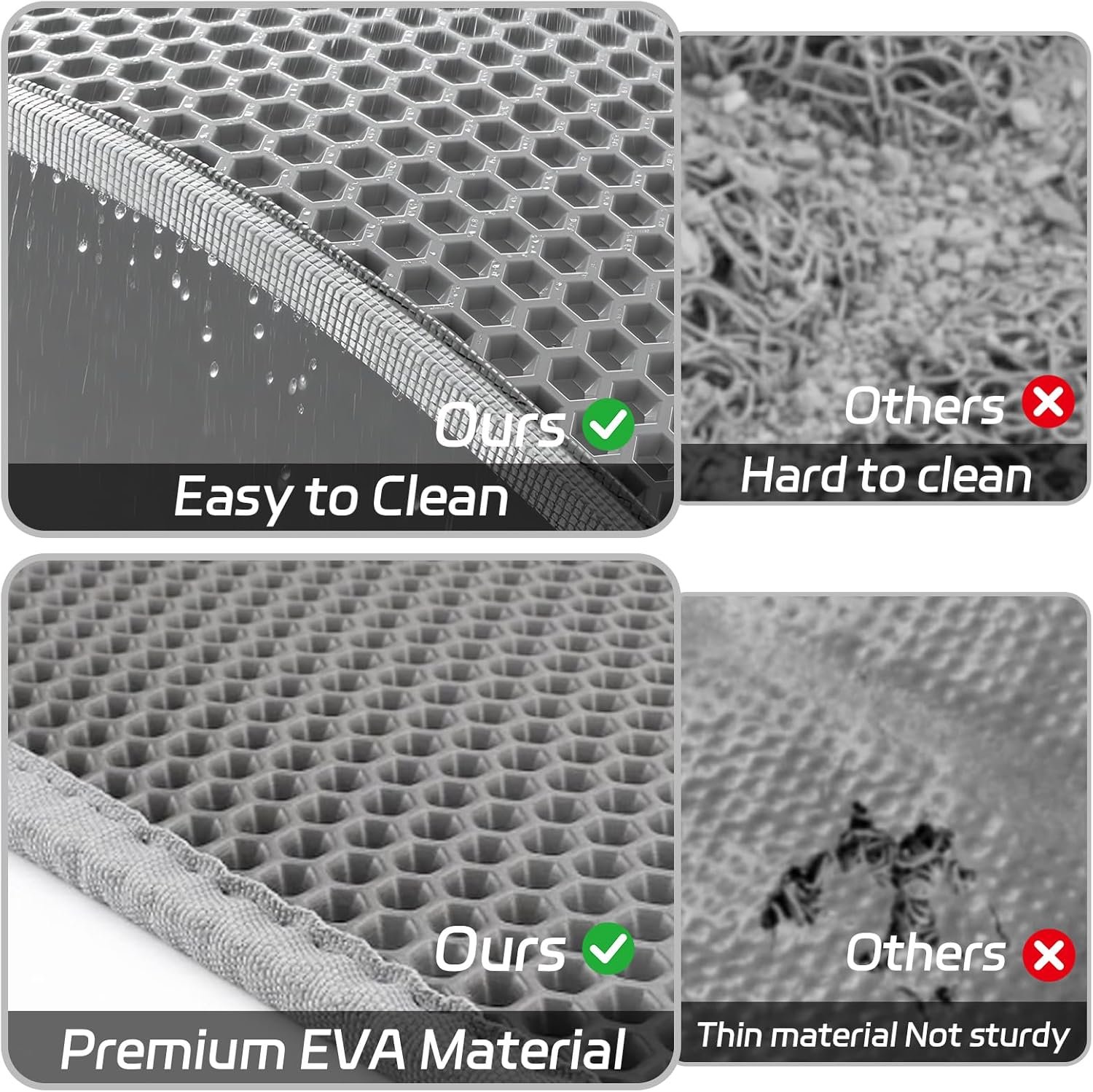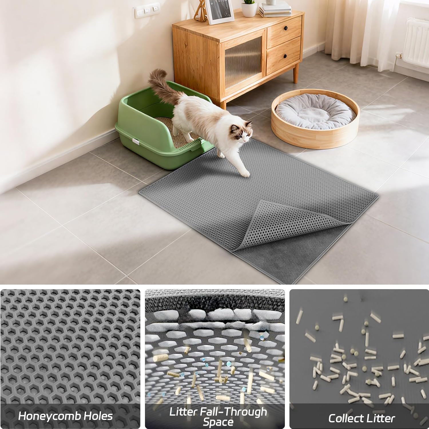 Das doppelschichtige Design eignet sich hervorragend zum Auffangen von Katzenstreu und fängt Streu und Urin perfekt auf. Die wasserdichte Rückseite verhindert, dass Schmutz durchdringt und Katzenstreu im ganzen Haus verstreut. Es schützt Ihre Böden vor Kratzern.