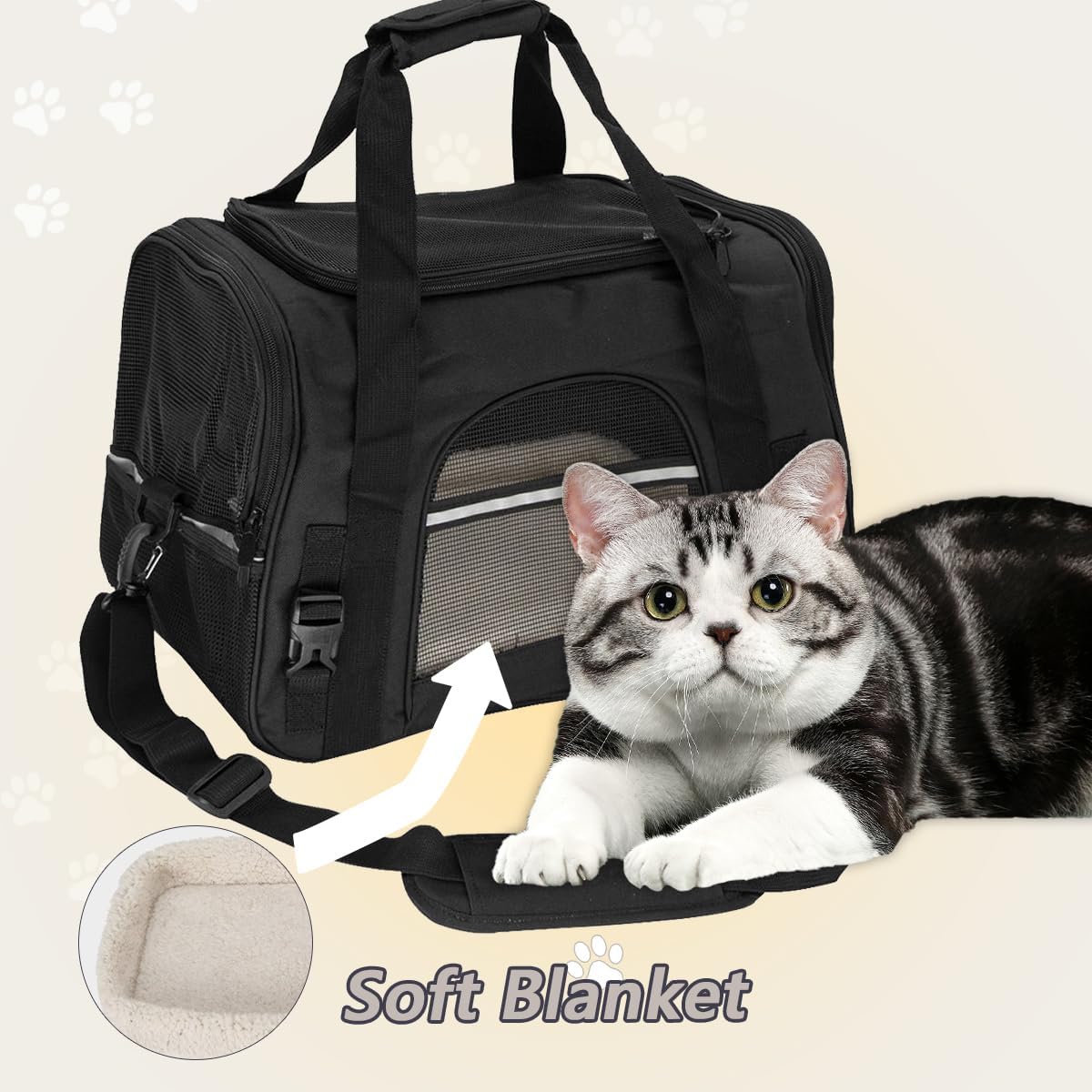DETAILLIERTES DESIGN: Die Katzentransporttasche verfügt auf einer Seite über reflektierende Streifen, um die Sicherheit bei Nachtreisen zu gewährleisten. An der Außenseite der Transporttasche befindet sich außerdem eine kleine Tasche zur Aufbewahrung von Haustiersnacks und anderen Gegenständen. Die Innenseite der Tragetasche ist mit einer speziellen Schnalle ausgestattet, die verhindert, dass Ihr Hund verloren geht.
