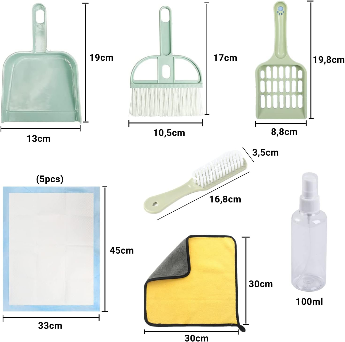 Reinigungsset: 1 x Reinigungsset (1 x Besenbürste, 1 x Kehrschaufel), 1 x Schuhbürste, 1 x Sprühflasche, 1 x Katzenschaufel, 5 x Wickelunterlage, 1 x Mikrofasertuch, 1 x Aufbewahrungstasche