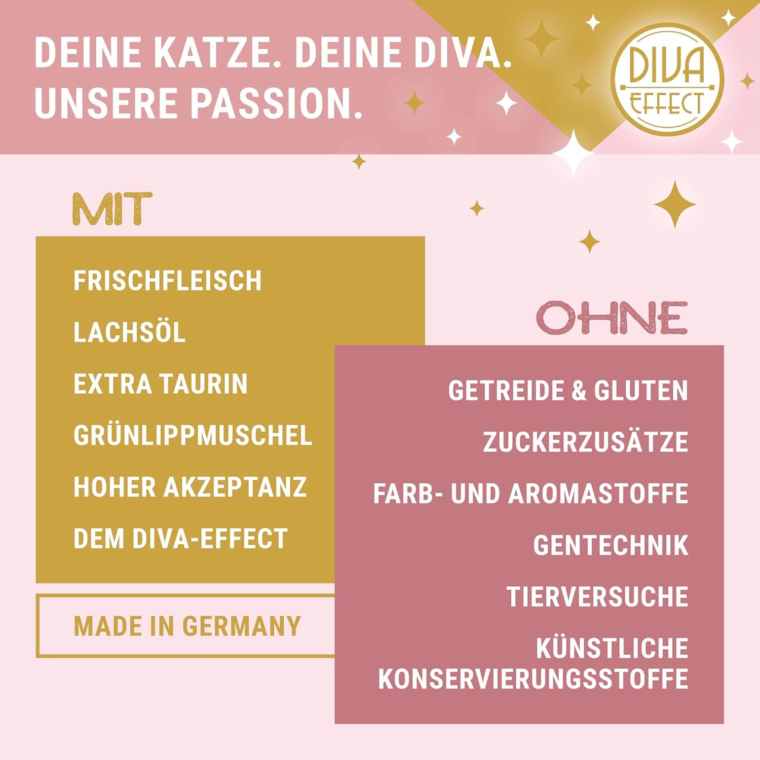Diva-Effekt für Kätzchen: Unsere luxuriösen Futterkreationen sorgen für strahlende Schönheit, für sprudelnde Energie durch Immunstärkung, für verwöhnende Pflege von innen und für ganzheitliches Wohlbefinden von Körper und Geist