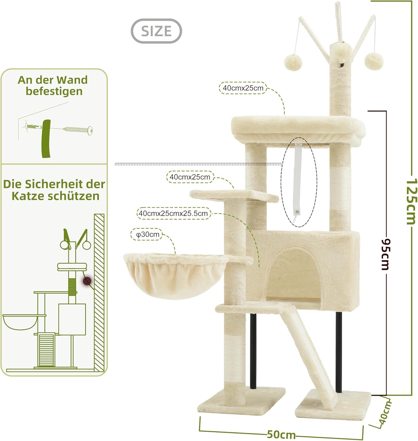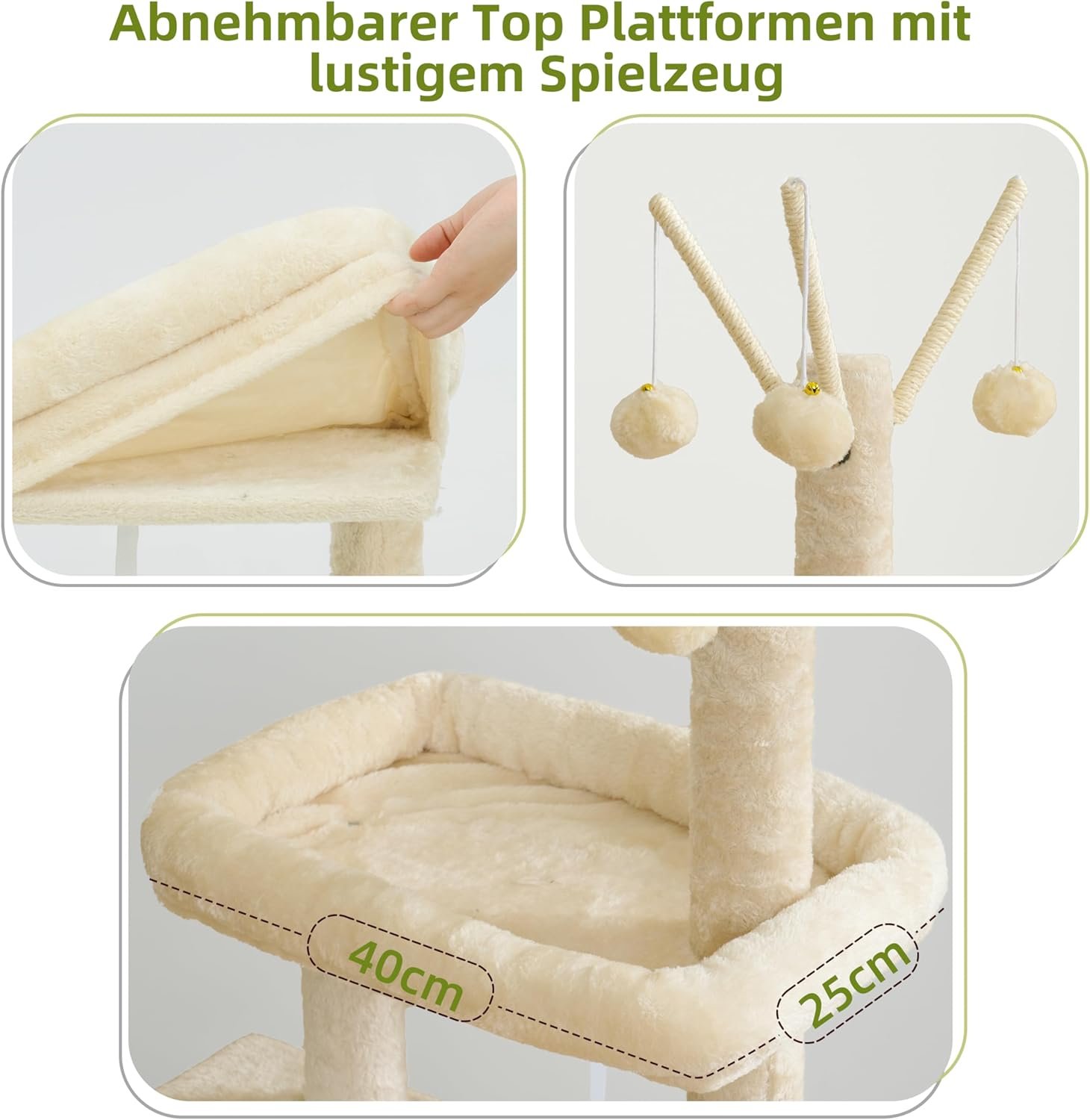 Abnehmbare Plattformen mit Spielzeug: Der kleine Kratzbaum ist mit einer geräumigen oberen Plattform ausgestattet, auf der die Katze bequem liegt und die zum Reinigen leicht abnehmbar ist. An der Säule hängen drei Plüschbälle, mit denen Katzen spielen können