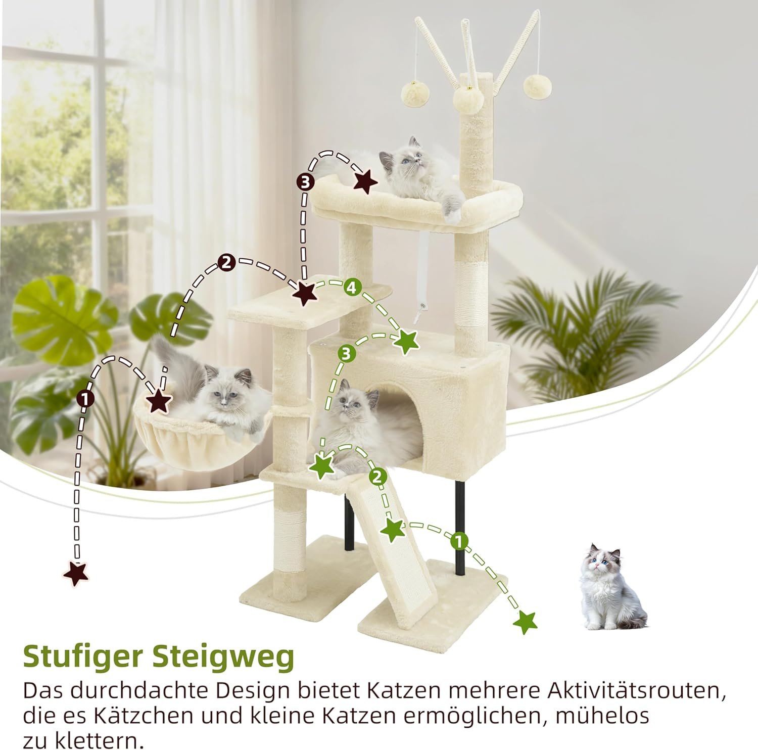 Hohe Interaktivität: Geräumige Sitzstange, weiche Hängematte, verdecktes Bett, natürliche Sisal-Kratzer; flauschige Quasten an dreiarmigen Pfosten, Katzen können frei springen, spielen, klettern und ihre Instinkte befriedigen.