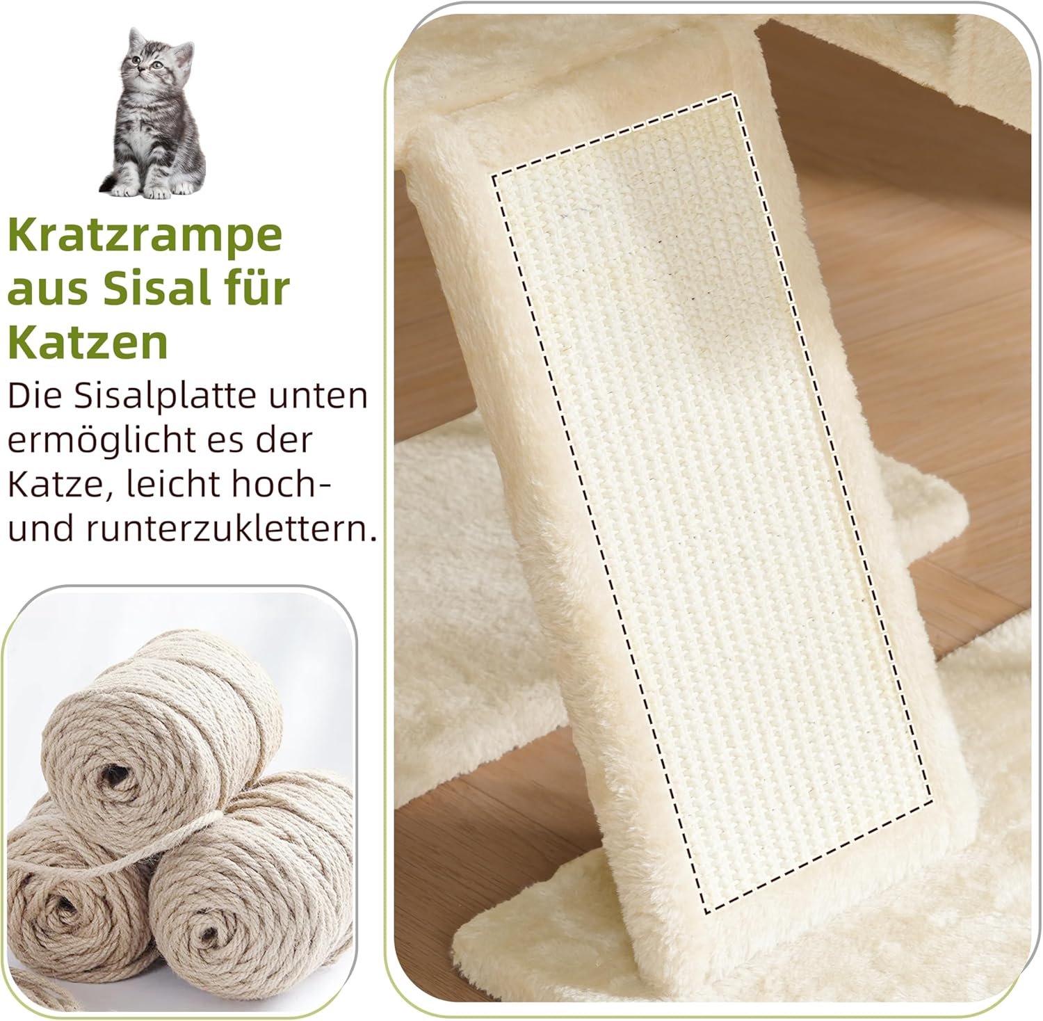 Nur für Innengebrauch: Optimiertes Spanplattenmaterial, Plüschgewebe und Sisal (stabil & weich). Langfristige Außen Nutzung verursacht Abnutzung – nutze im Innenraum für Katzenkomfort und lange Produktlebensdauer.