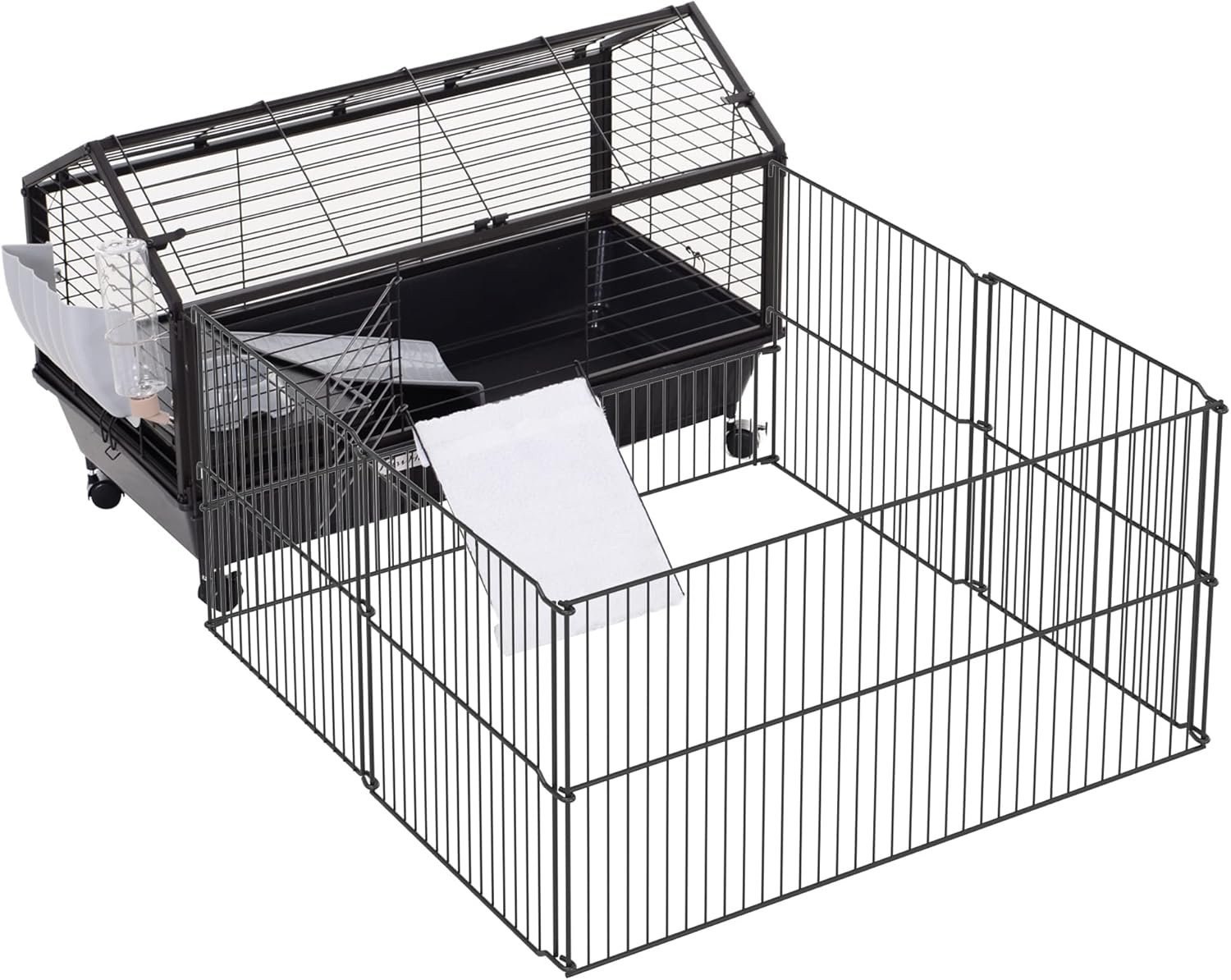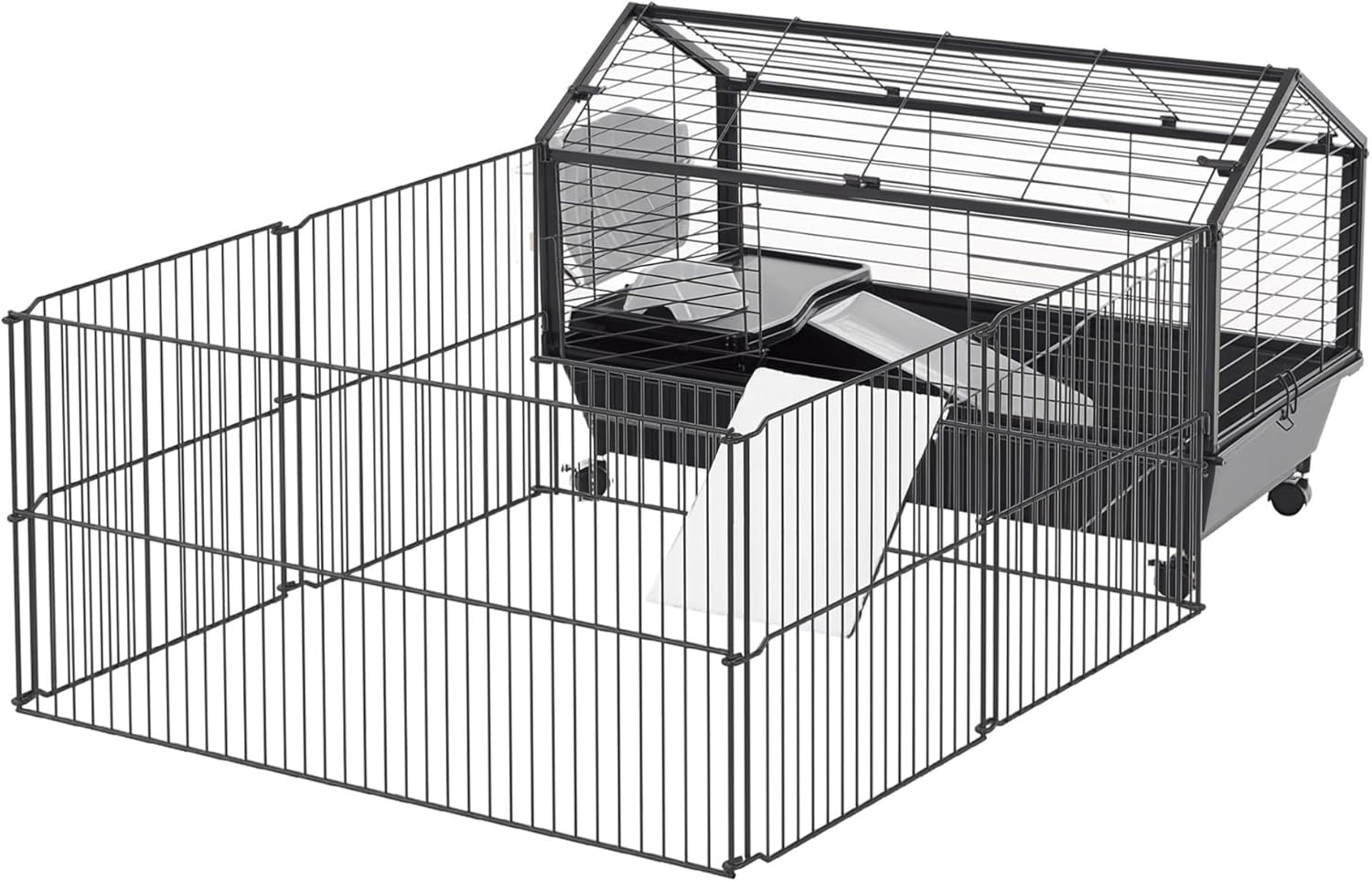 Dieser Kleintierkäfig von kommt mit einem großen Auslauf und Zubehör. Eine Wasserflasche, eine Heuraufe und eine Rampe sind im Lieferumfang enthalten. Bei Nichtgebrauch kann der Auslauf zusammengeklappt und platzsparend aufbewahrt werden. Dank seiner vier Rollen kann er ganz einfach von draußen nach drinnen bewegt werden. Dieser Kleintierkäfig von ist das ideale Zuhause für ihre Haustiere.