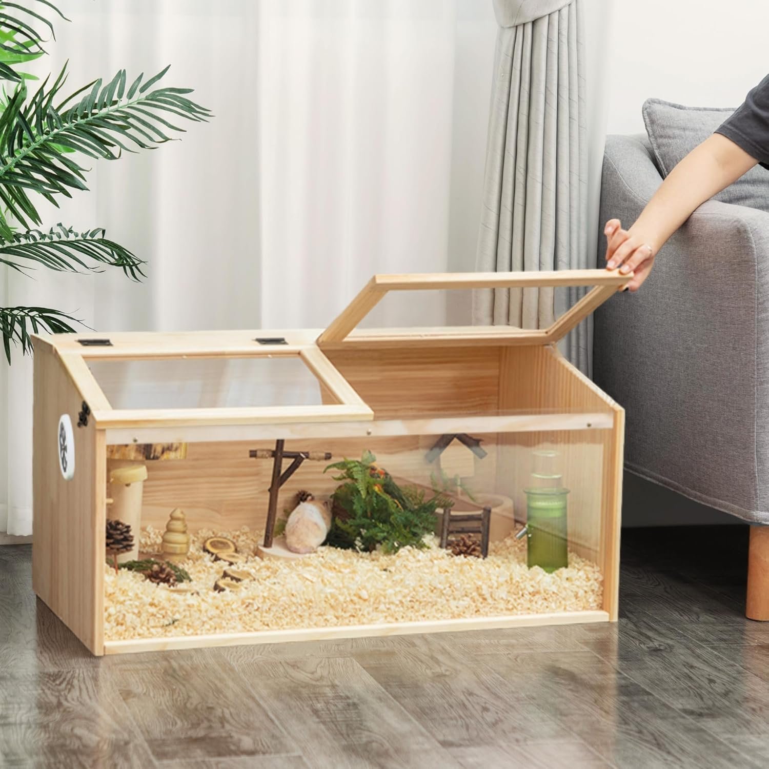 LANGLEBIGE MASSIVE HOLZKONSTRUKTION Unsere Hamsterkiste besteht aus 0,6 Zoll dickem Kiefernholz und transparenten Acrylplatten, die für Stabilität und Kaufestigkeit sorgen. Das natürliche Material ist sicher und sorgt für einen komfortablen, natürlichen Lebensraum