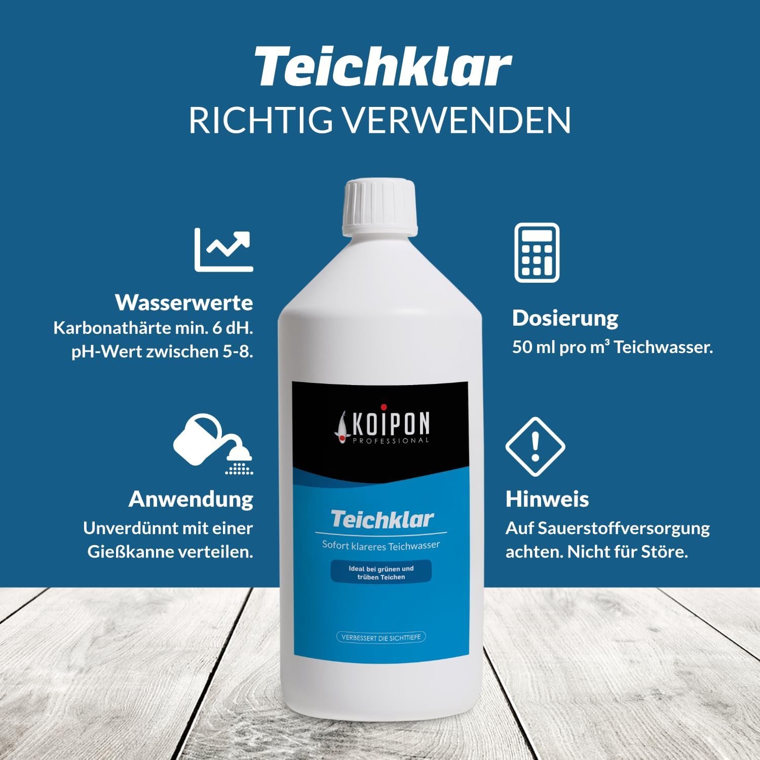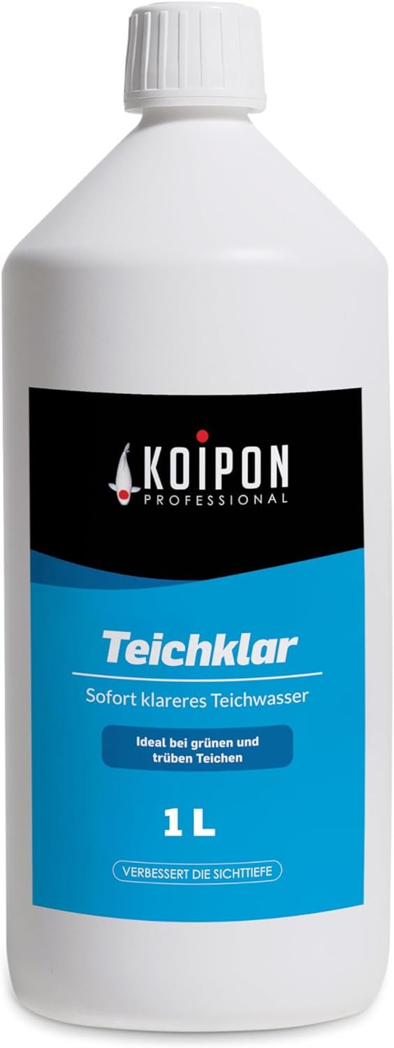 Lieferumfang: 1 x KOIPON Teichklar 1 Liter, Teichwasseraufbereiter und Phosphatbinder für kristallklares Teichwasser und Teichpflege von pH- und KH-Wert sowie Teichreinigung von trüben und grünen Fischteichen.