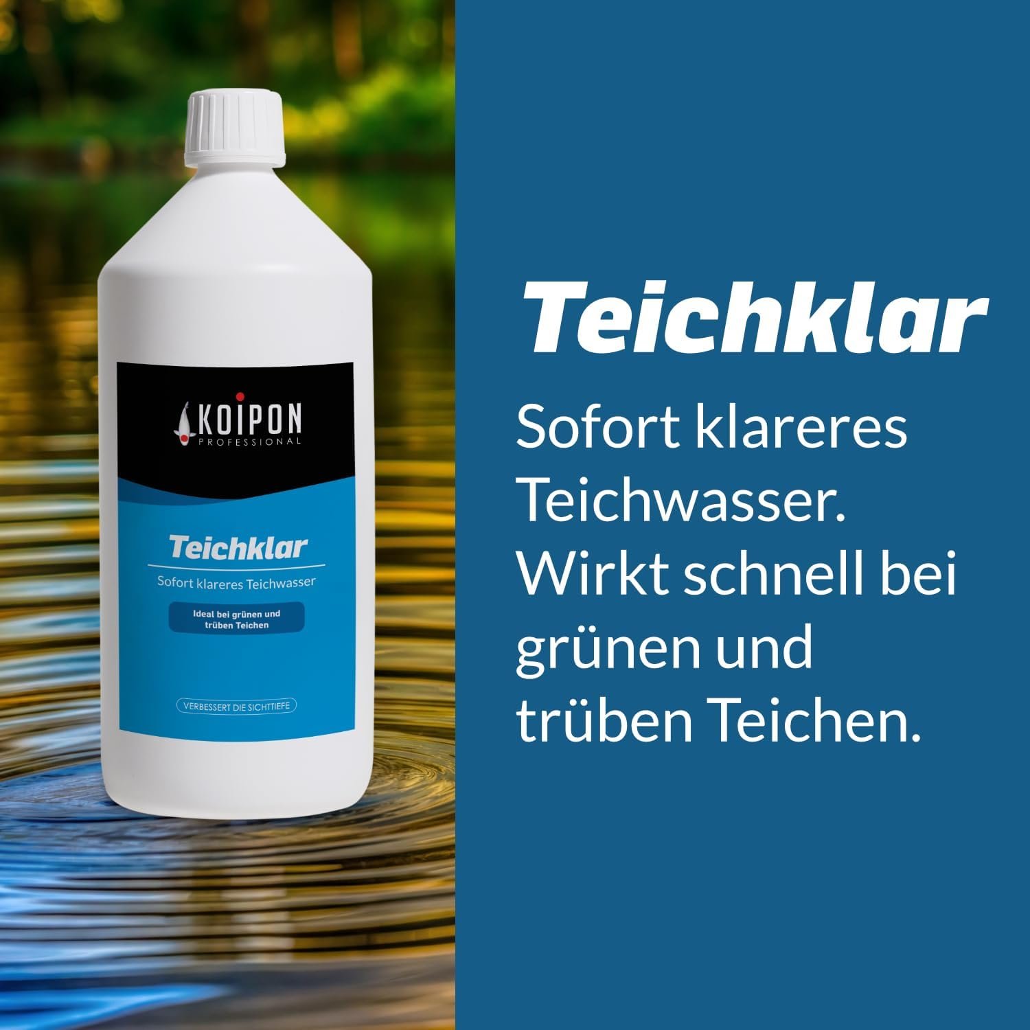 Deutsche Markenqualität: KOIPON Teichklar ist ideal zur Teichreinigung und Wasseraufbereitung und reinigt schnell und effektiv grünes oder trübes Teichwasser.