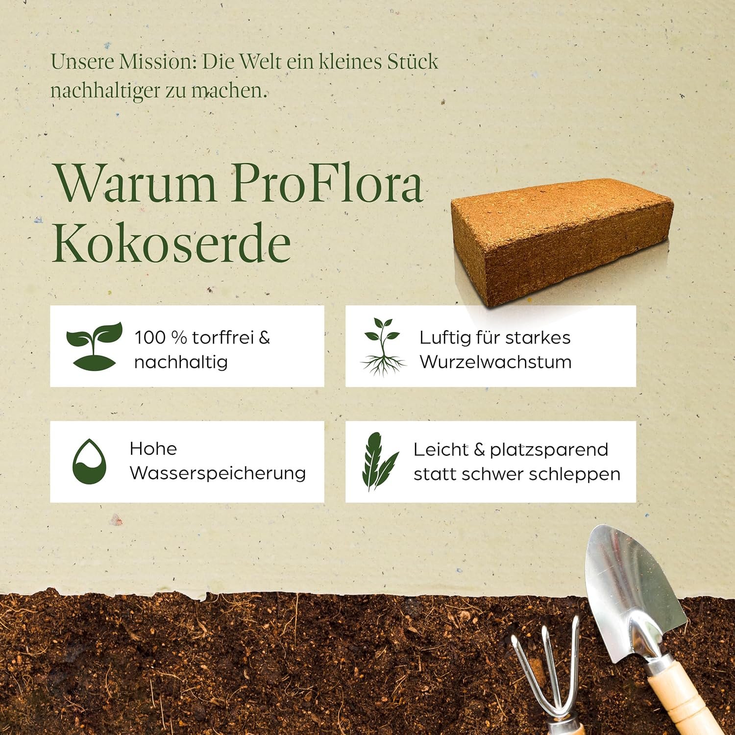 Unser ProFlora Kokoserde: 100 % torffrei & nachhaltig Fördert starkes Wurzelwachstum Speichert Wasser, bleibt luftig Wasser dazu – fertig nutzbar Leicht, sauber, kompakt gepresst
