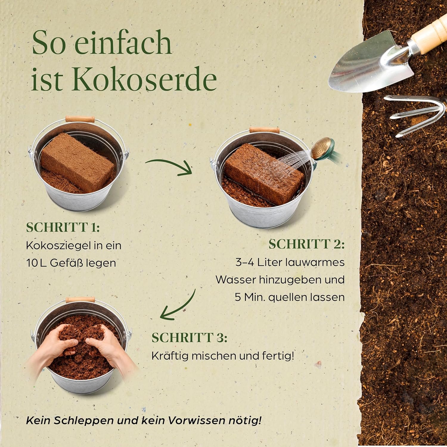 Einfache Anwendung – Die Handhabung ist sehr einfach. Durch Zugabe von Wasser werden aus den Ziegeln mühelos 8 Liter hochwertige, gebrauchsfertige Kokosnusserde.