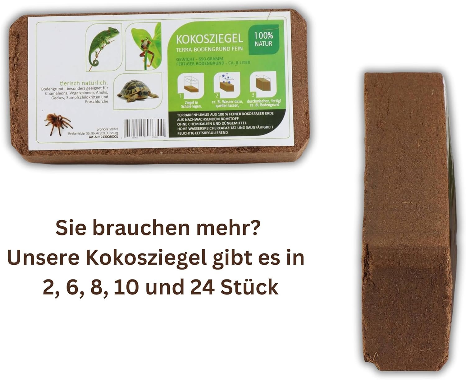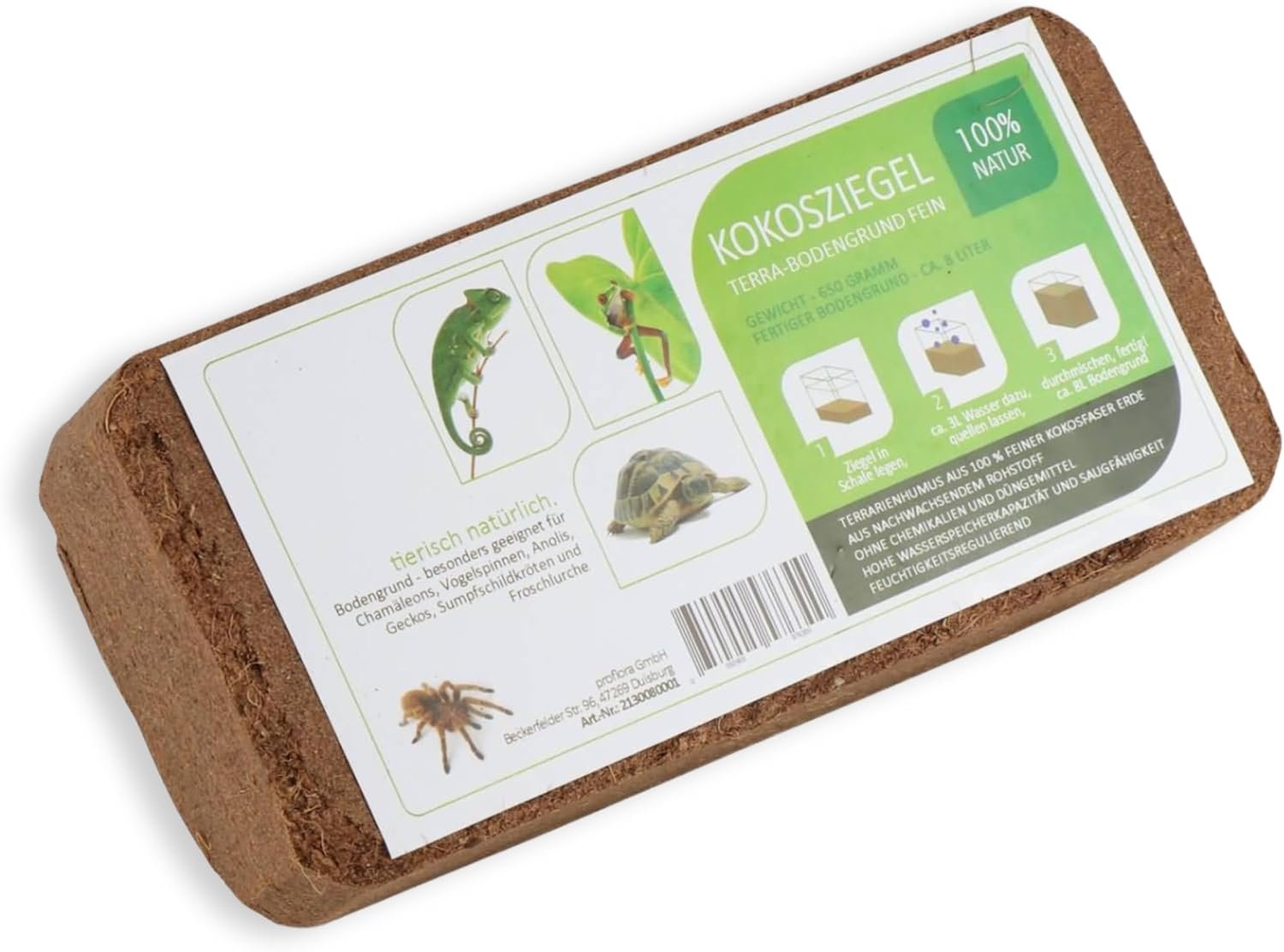 Kokosfasern: Der Ziegel besteht aus gepressten Kokosfasern, die eine große Menge Wasser speichern können und gleichzeitig für eine effiziente Belüftung sorgen, was zu einer optimalen Luftfeuchtigkeit im Terrarium beiträgt.