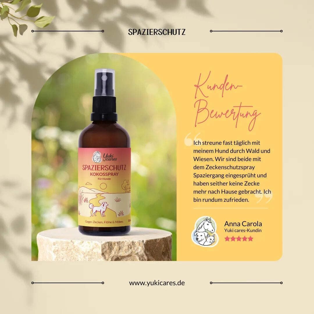 Der Yuki Cares Kokosspray Gehschutz vereint bekannte natürliche Hausmittel gegen einen Befall mit Zecken, Flöhen und Milben.