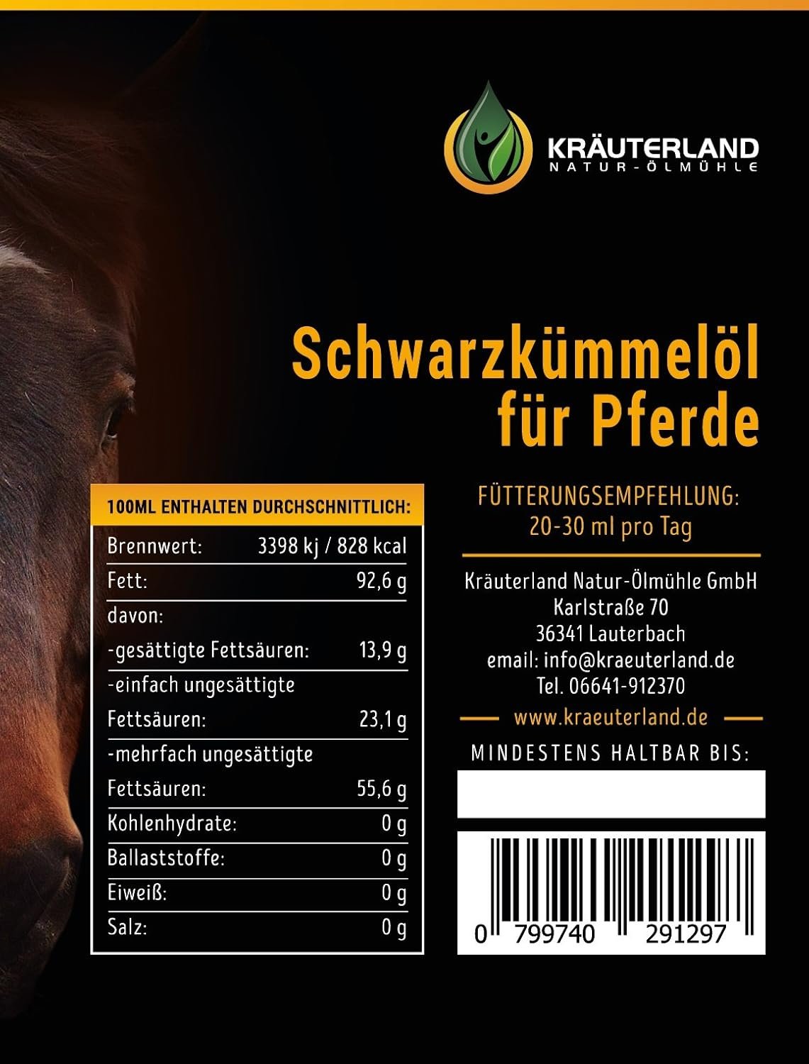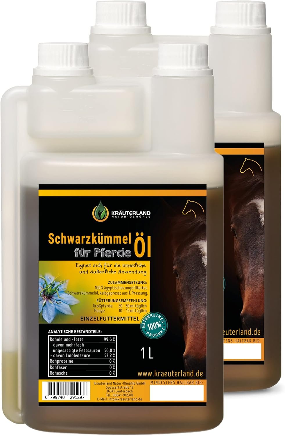 Unser Schwarzkümmelöl für Pferde ist 100 % rein, ungefiltert, kaltgepresst aus der 1. Pressung, enthält keine Konservierungsstoffe oder sonstige Zusatzstoffe.