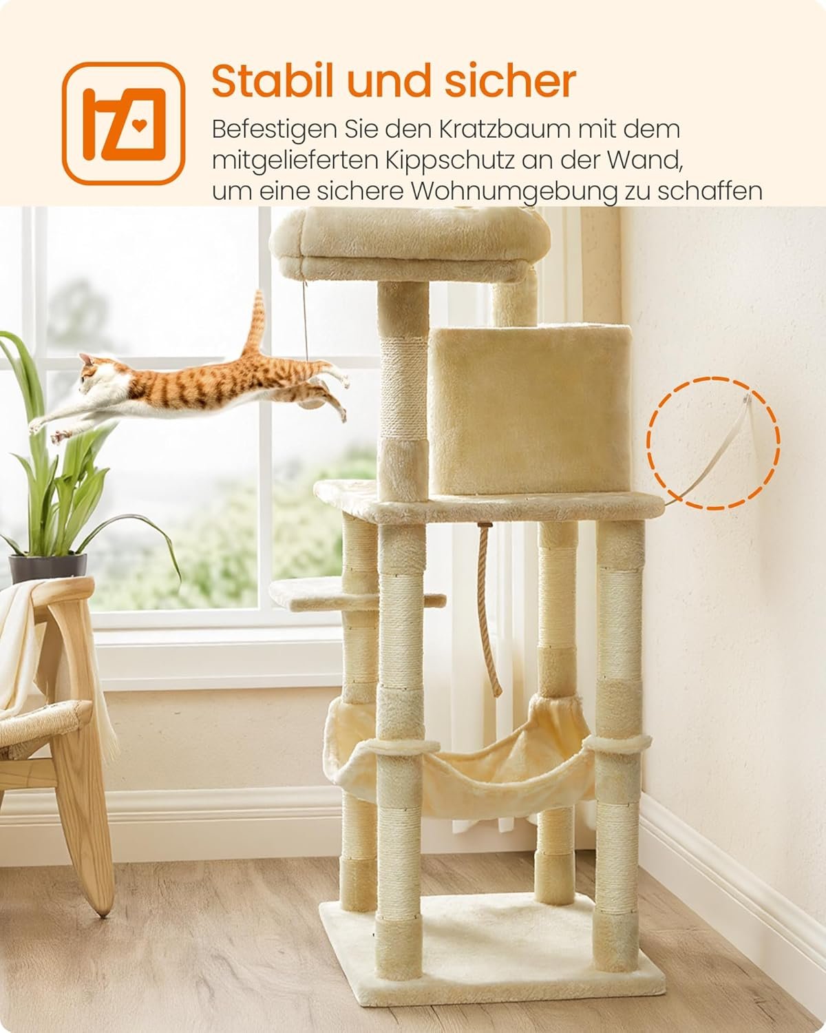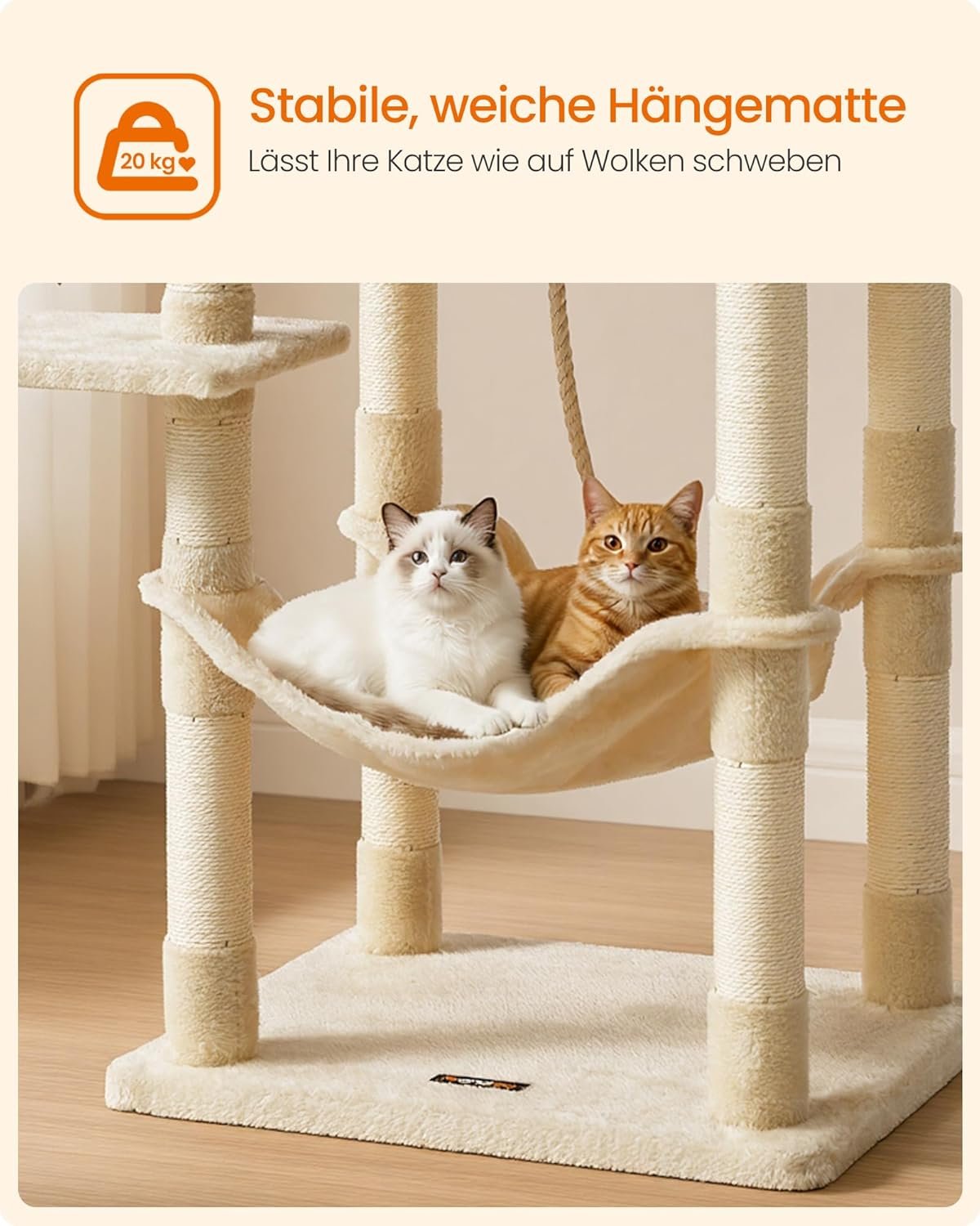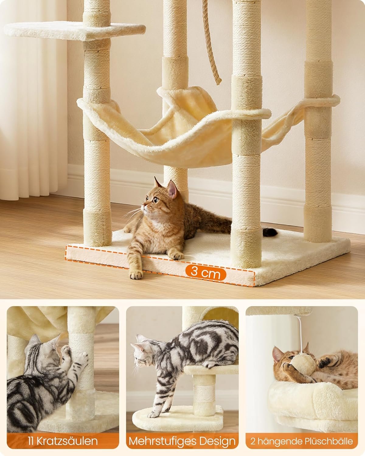 Für einen guten Überblick: 2 gepolsterte Aussichtsplattformen. Für entspannte Stunden: große, kuschelige Hängematte. Für Groß und Klein: treppenartige Ebenen für einfachen Aufstieg. Für kuschelige Kätzchen: flauschiger Bezug aus strapazierfähigem Plüsch. Für noch mehr Spielspaß: mit Sisal umwickelte Rüssel, Spielseil.