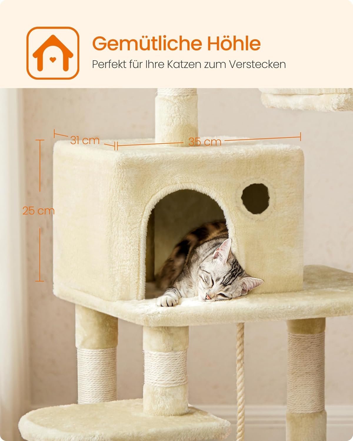 [2 Platforms and 1 Cave] Dieser Kratzbaum verfügt über zwei Plattformen mit gepolsterten Kanten und eine Kuschelhöhle, die Katzen mehr Platz zum Beobachten und Ausruhen bietet. Es ist für Haushalte mit mehreren Katzen geeignet