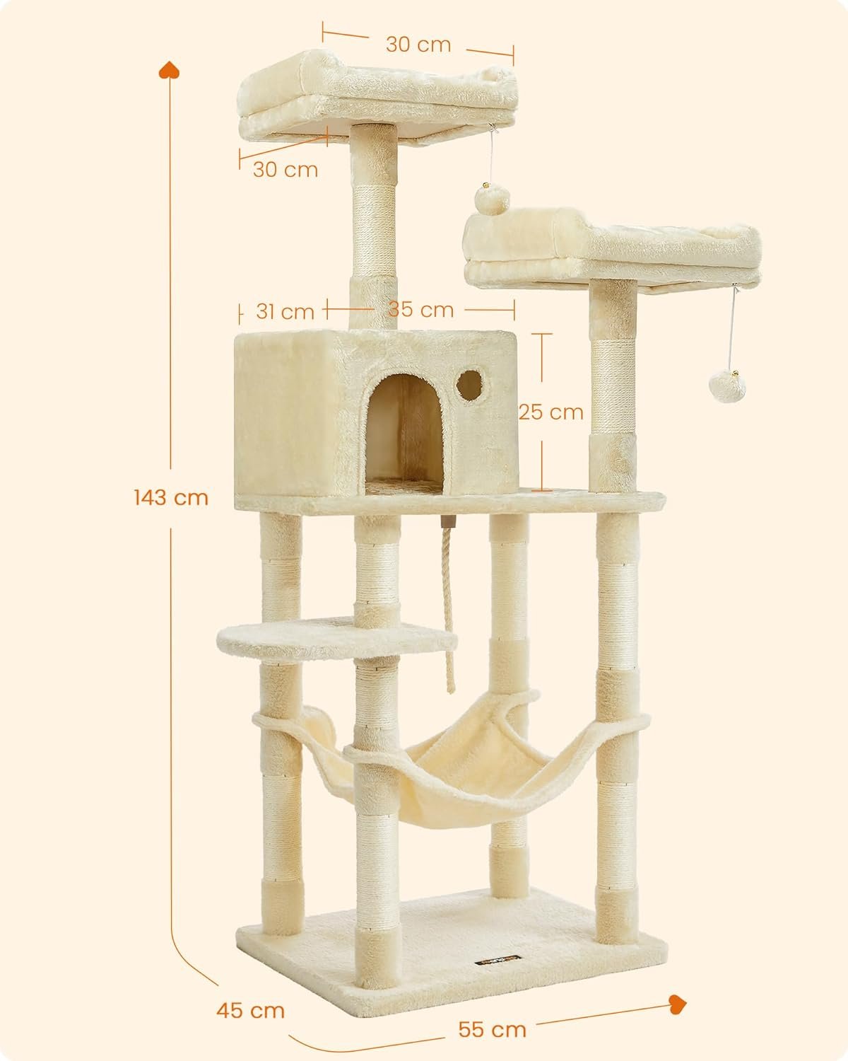 Dieser 55 x 45 x 143 cm große Kratzbaum eignet sich auch für Katzenliebhaber mit kleineren Wohnungen, die Ihrem Schnurrbart aber dennoch ein Zuhause mit vielfältigen Schlaf- und Ruhemöglichkeiten bieten möchten.