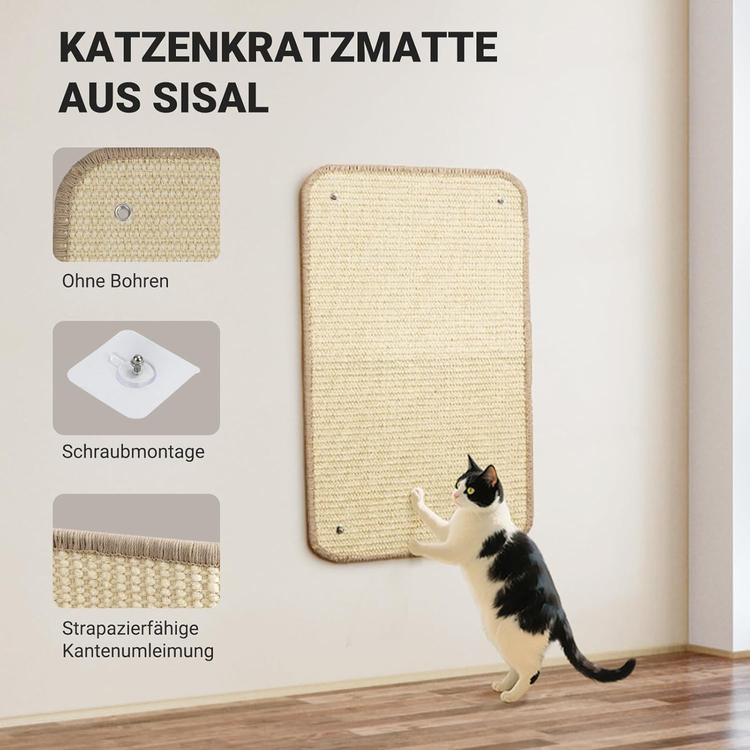 MULTIFUNKTIONALE KRATZEMATTE Diese Kratzmatte kann als Bodenkratzbrett auf den Boden geklebt, mit Schrauben an der Wand oder mit Schrauben am Stoffsofa befestigt werden. Es bietet Ihrer Katze vielseitige Möglichkeiten zum Kratzen.