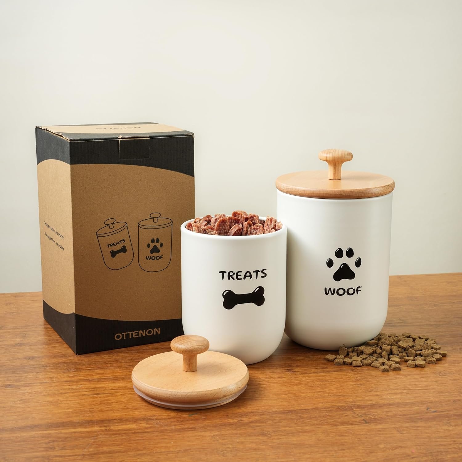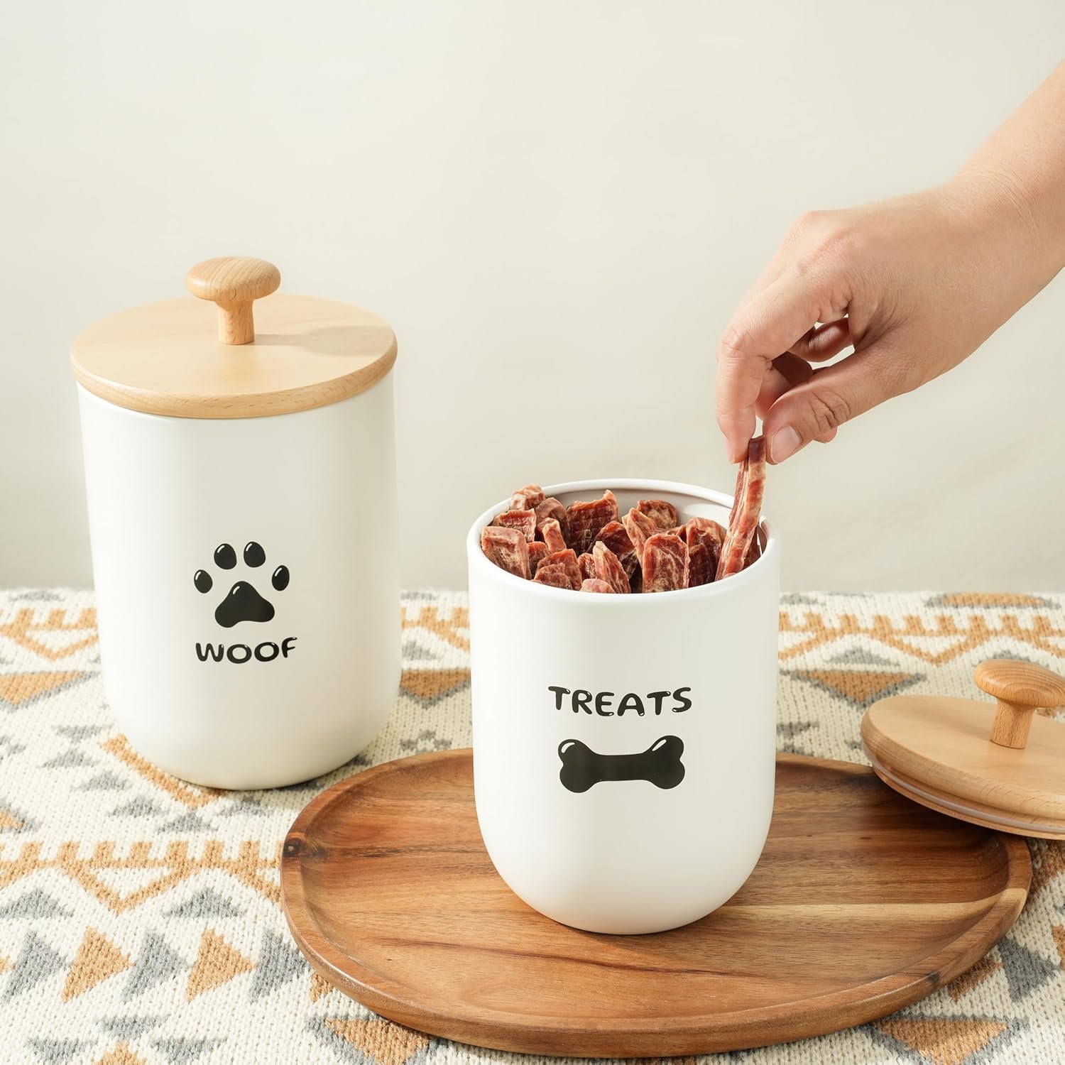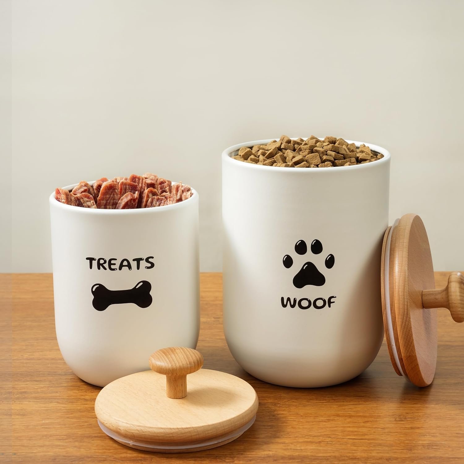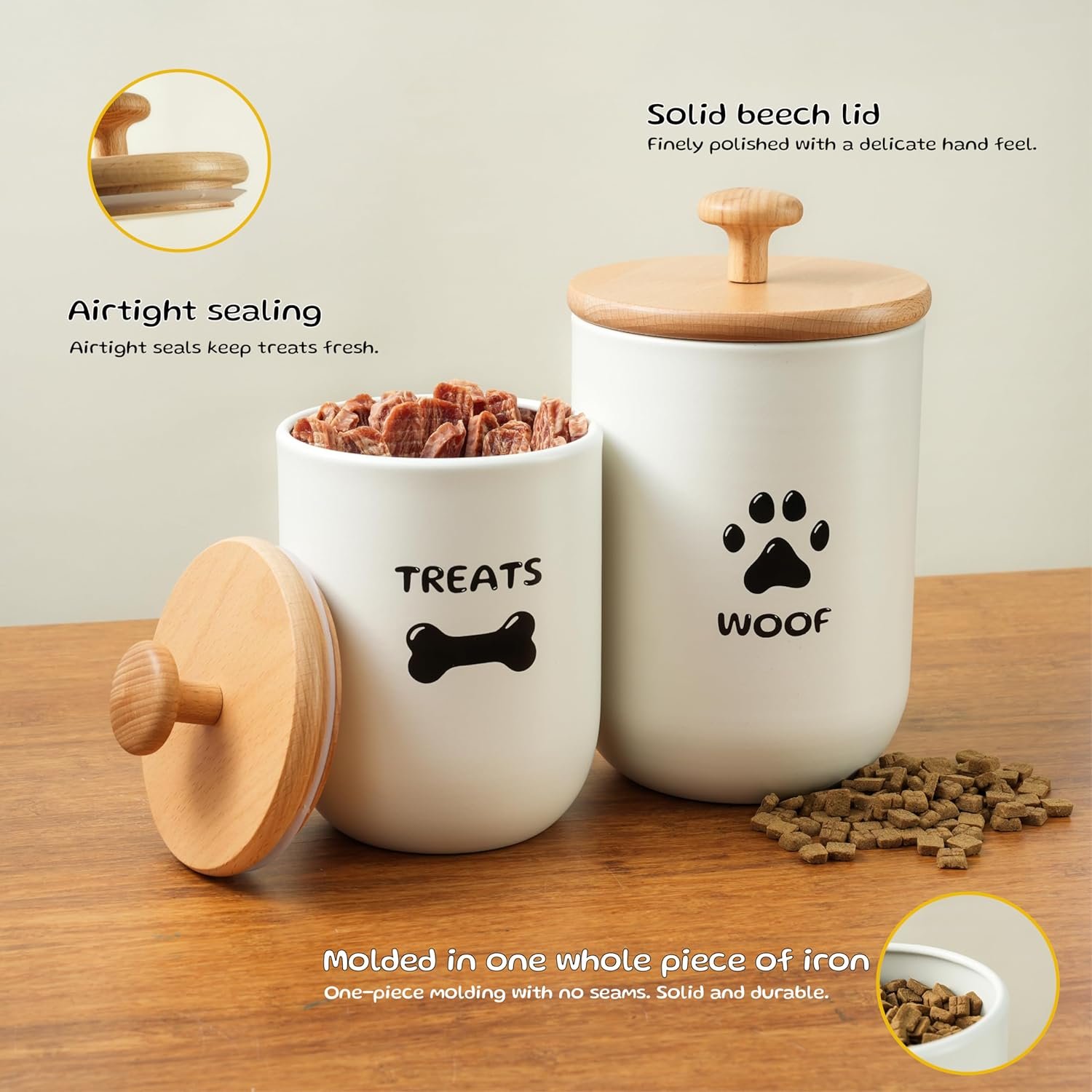 Luftdichte Deckel halten Leckereien frisch – die gummierten Bambusdeckel halten harte oder weiche Leckereien, Zahnstäbchen oder Trockenfutter feuchtigkeitsfrei und lecker. Hier gibt es keine abgestandenen Leckereien! Ihr guter Junge/Mädchen verdient diesen Leckerlibehälter für Hunde mit luftdichten Deckeln.