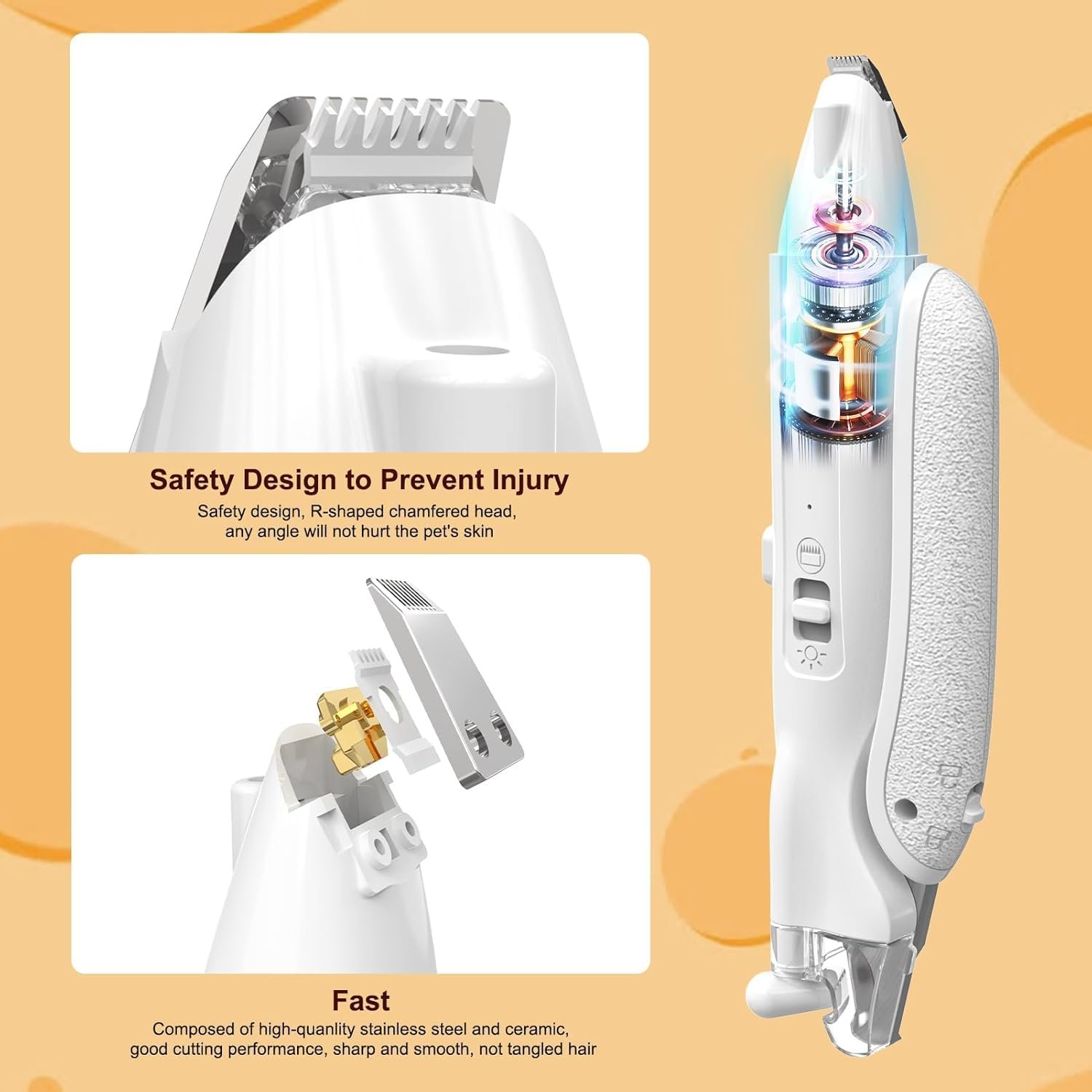 Leises und vibrationsarmes Design: Der Tierhaarschneider verfügt über einen verstellbaren, verbesserten Motor, der weniger Vibrationen erzeugt. Der Geräuschpegel des Trimmerhundes beträgt weniger als 60 dB, sodass sich Ihr Haustier während des gesamten Friseurvorgangs wohl fühlt.