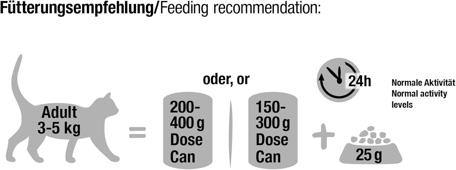 High organic quality. Thanks to the high biological value of the processed raw materials, your cat needs a comparatively small amount to cover their daily needs. Feed 100-300g daily for kittens up to one year.