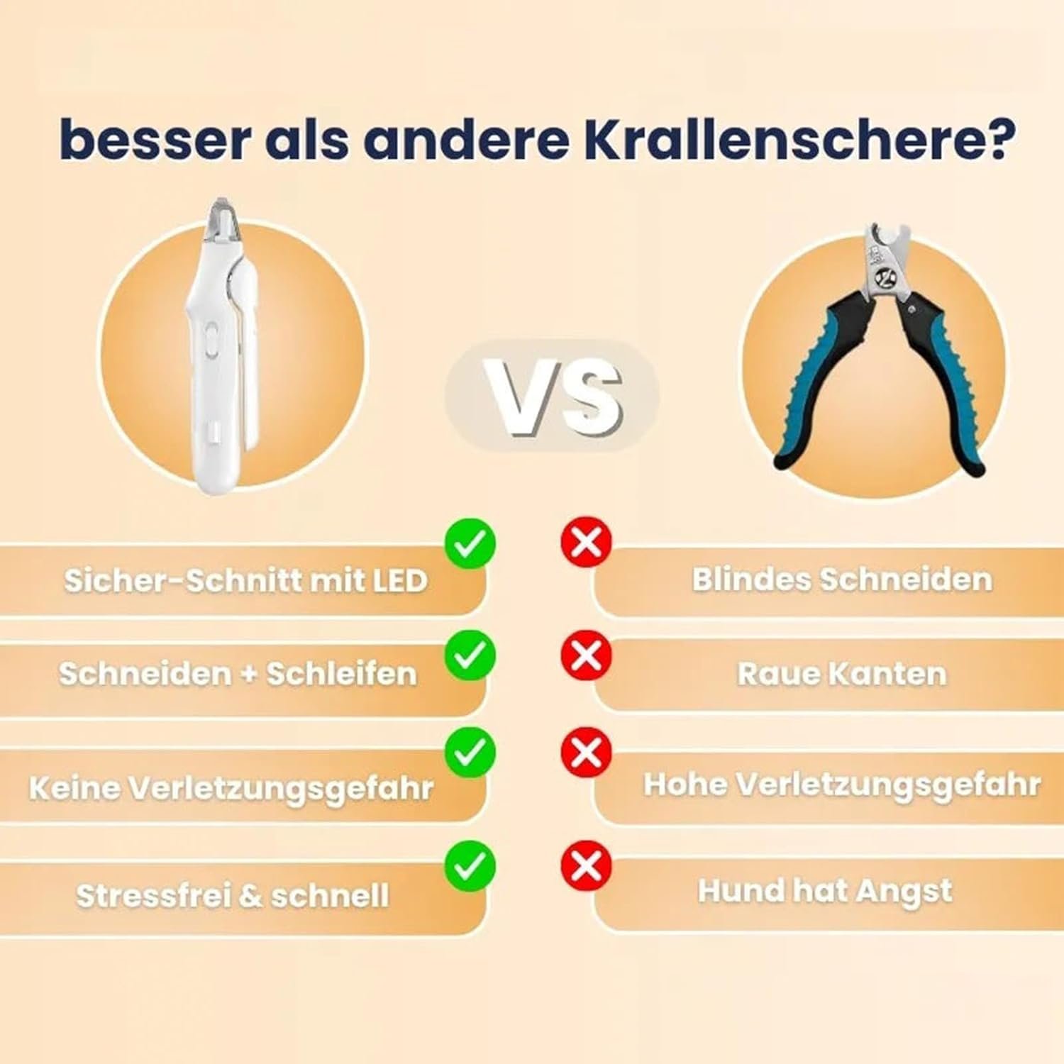 Ausgestattet mit LED-Leuchten für bessere Sichtbarkeit: Zwei integrierte LED-Leuchten beleuchten empfindliche Nerven auch unter dunklen Nägeln. Machen Sie sich keine Sorgen mehr über einen zu tiefen Schnitt, wodurch das Verletzungsrisiko für Ihr Haustier zuverlässig minimiert wird.