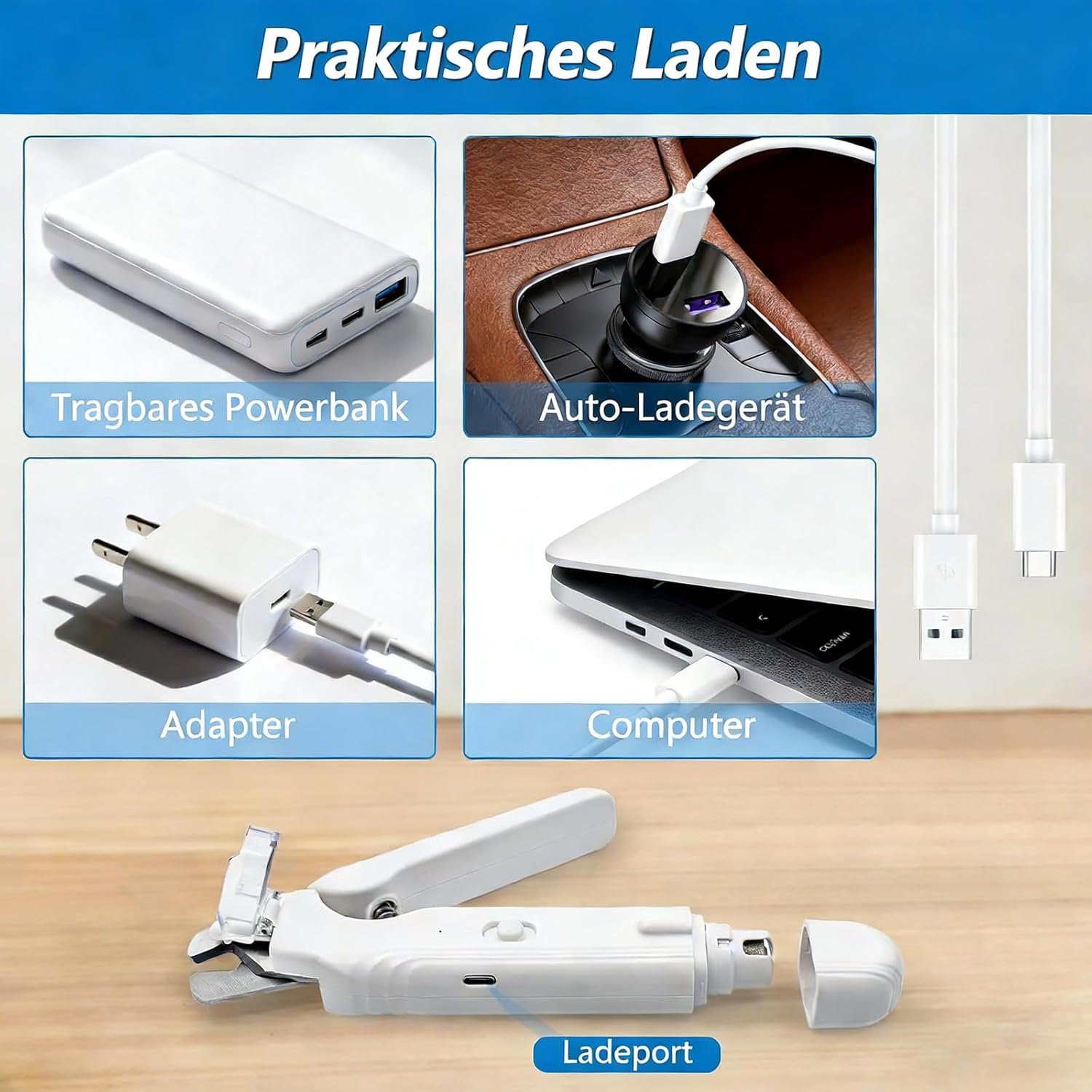 Kompatibel mit allen Typ-C-Kabeln: kein spezielles Ladegerät erforderlich. Eine vollständige Ladung ermöglicht eine Nutzungsdauer von bis zu 4 Stunden.